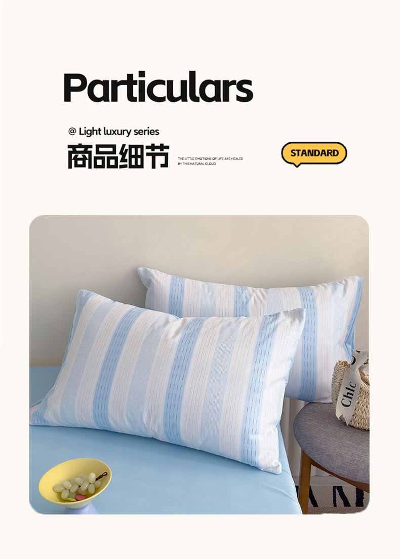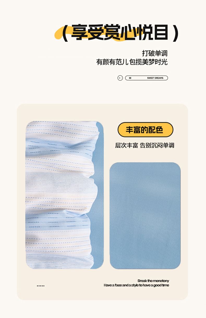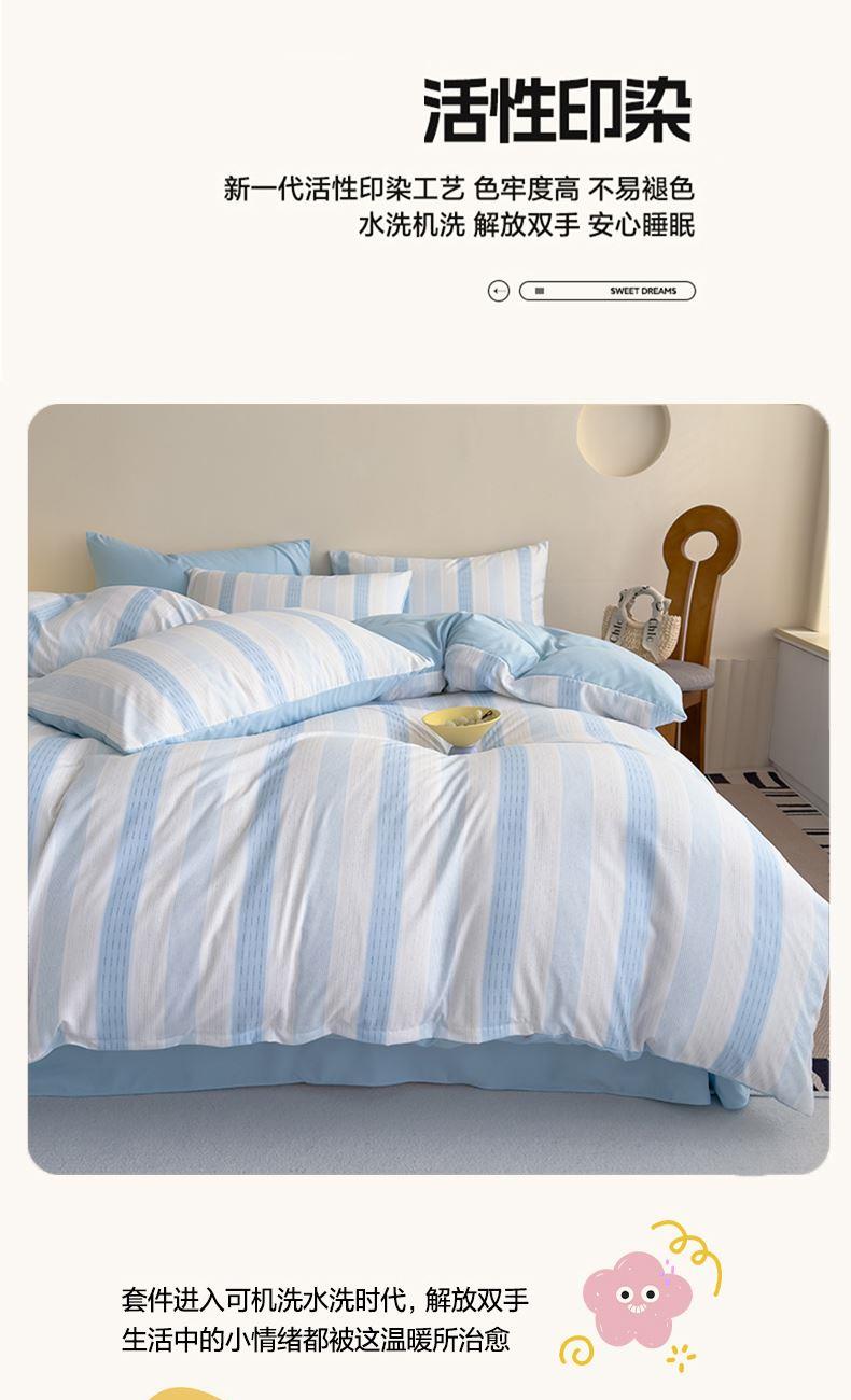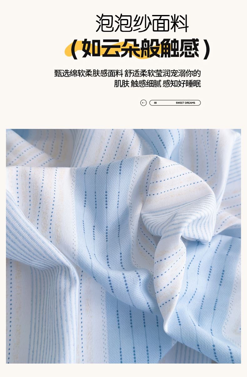 被套:200*230cm 床单:230*235cm 枕套:48*74cm*2 面料:泡泡纱(聚酯纤维) 执行标准:GB/T22796-2021 安全类别:GB18401-2010 B类 1.泡泡纱是一种新型工艺的面料,可水洗,可机洗,直接放进洗衣机,色牢度高,不易掉色和起球,色彩靓丽,不易变形给你想要的柔软亲肤干,舒适透气,整夜好眠。 面料采用新型环保浆料活性印染,不褪色,不缩水,其生态环保理念在很大程度上满足了消费者对床品舒适度的高要。