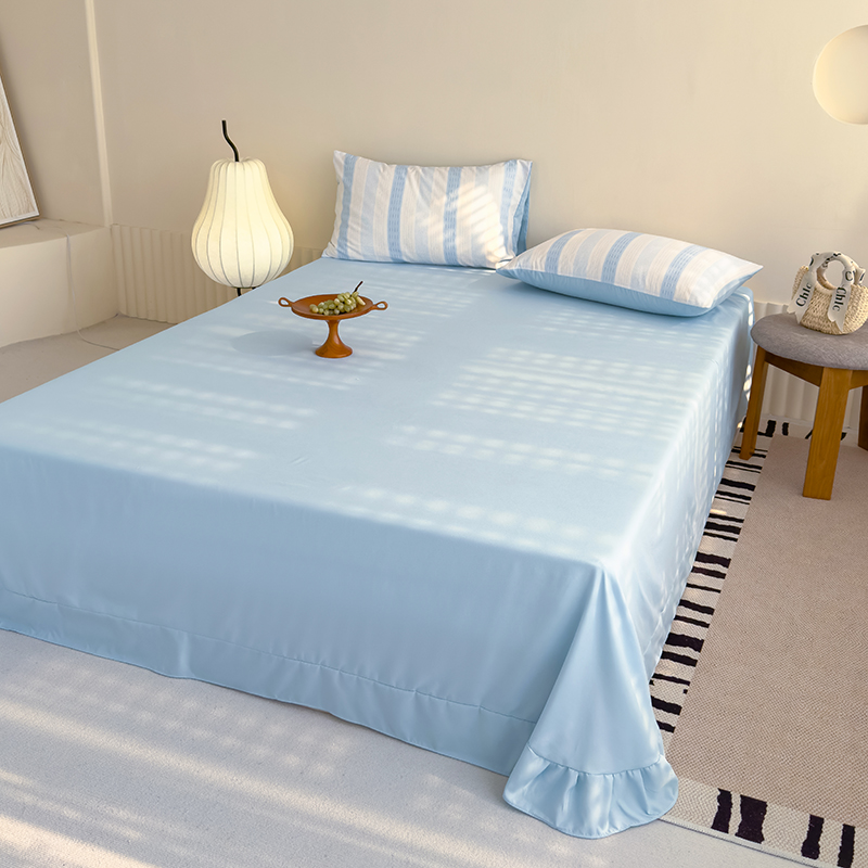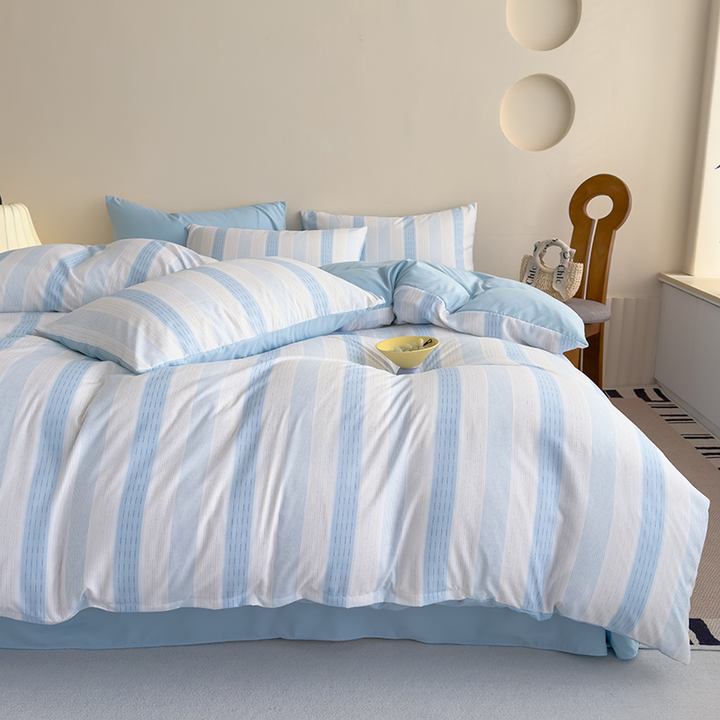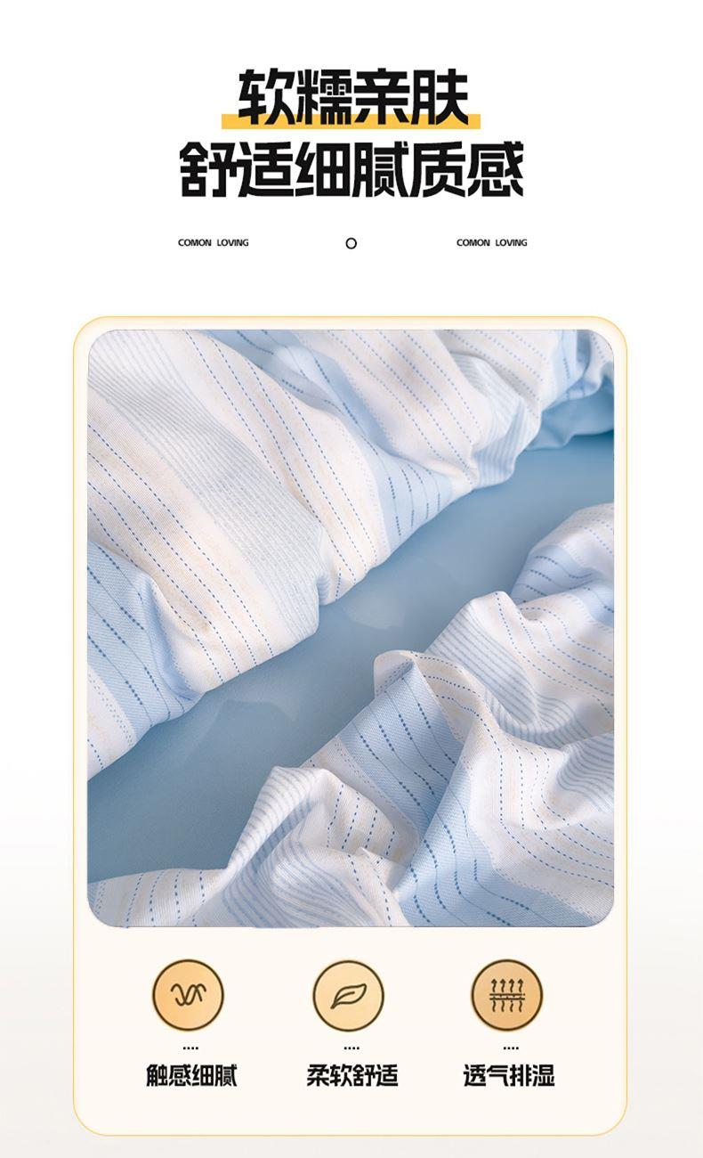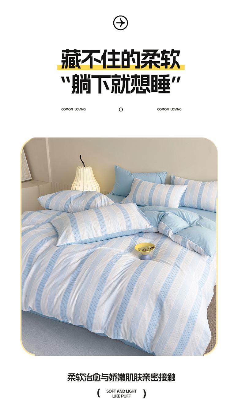 被套:200*230cm 床单:230*235cm 枕套:48*74cm*2 面料:泡泡纱(聚酯纤维) 执行标准:GB/T22796-2021 安全类别:GB18401-2010 B类 1.泡泡纱是一种新型工艺的面料,可水洗,可机洗,直接放进洗衣机,色牢度高,不易掉色和起球,色彩靓丽,不易变形给你想要的柔软亲肤干,舒适透气,整夜好眠。 面料采用新型环保浆料活性印染,不褪色,不缩水,其生态环保理念在很大程度上满足了消费者对床品舒适度的高要。