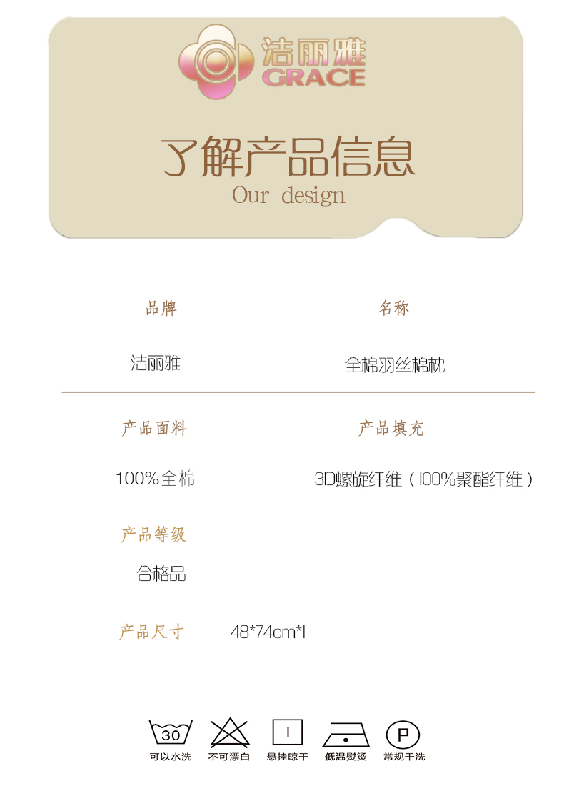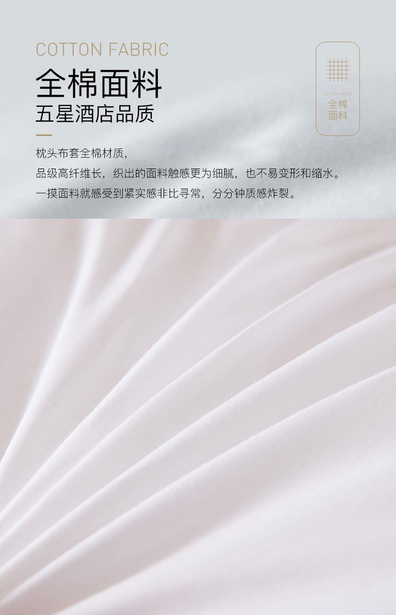 规格:48*74cm 面料:全棉 填充:3D螺旋纤维 执行标准:GB/T22796-2021 安全类别:GB18401-2010 A类 柔软舒适,精选优质全棉面料,良好的呵护颈椎,舒适的睡眠时光。面料透气网眼,不闷热,稀释透气。惊喜绗缝,优质绗缝工艺,不抛料,品质保障。 枕头高弹力,贴合人体脊椎生长曲度,仰睡侧睡都可以,给您更好的承托力。