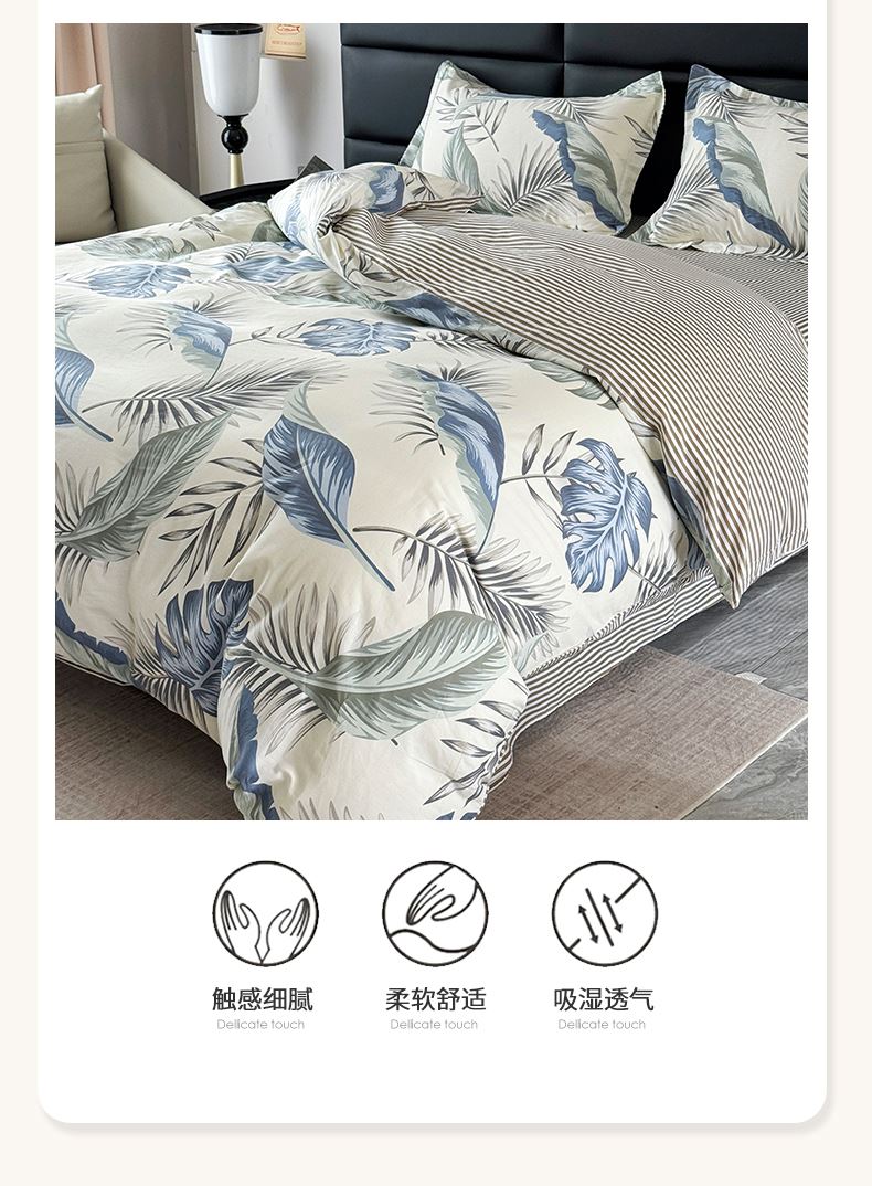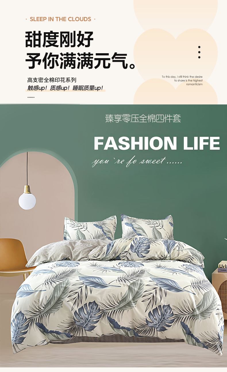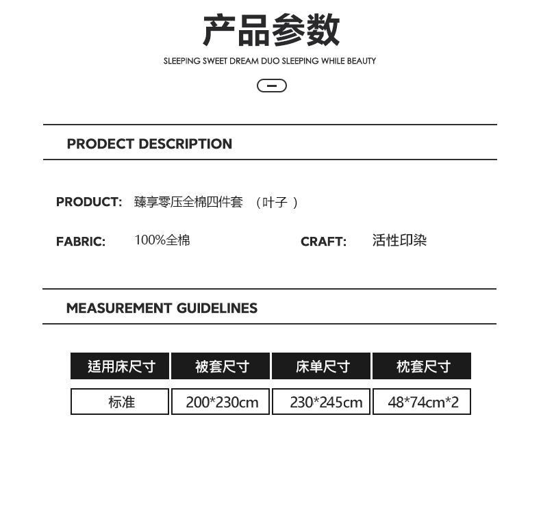 被套:200*230cm 床单:230*245cm 枕套:48*74cm*2 面料:全棉 执行标准:GB/T22796-2021 安全类别:GB18401-2010 A类 1.臻选纯棉面料,印染工艺采用活性印染工艺,不起球,不褪色,极具柔软性,在纺纱过程中,增加了精致梳理的程序,疏去软短的纤维,剔除棉花种的杂质,以制造出平滑的纱线,让棉花更有韧性,使人干到柔软。 2.纯棉纤维具有良好的保湿型,透气性能好,使用感觉温暖。