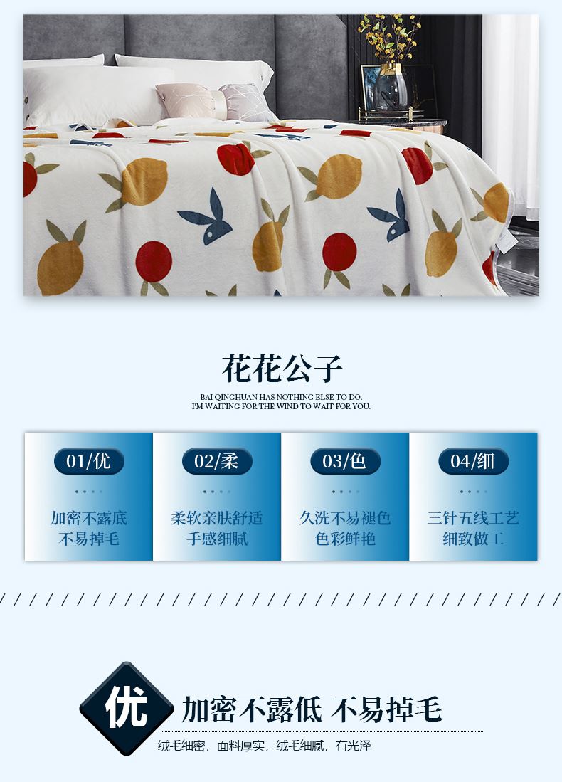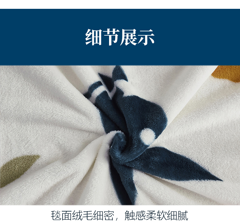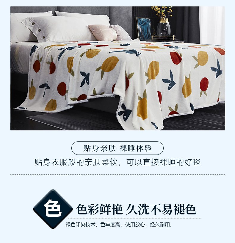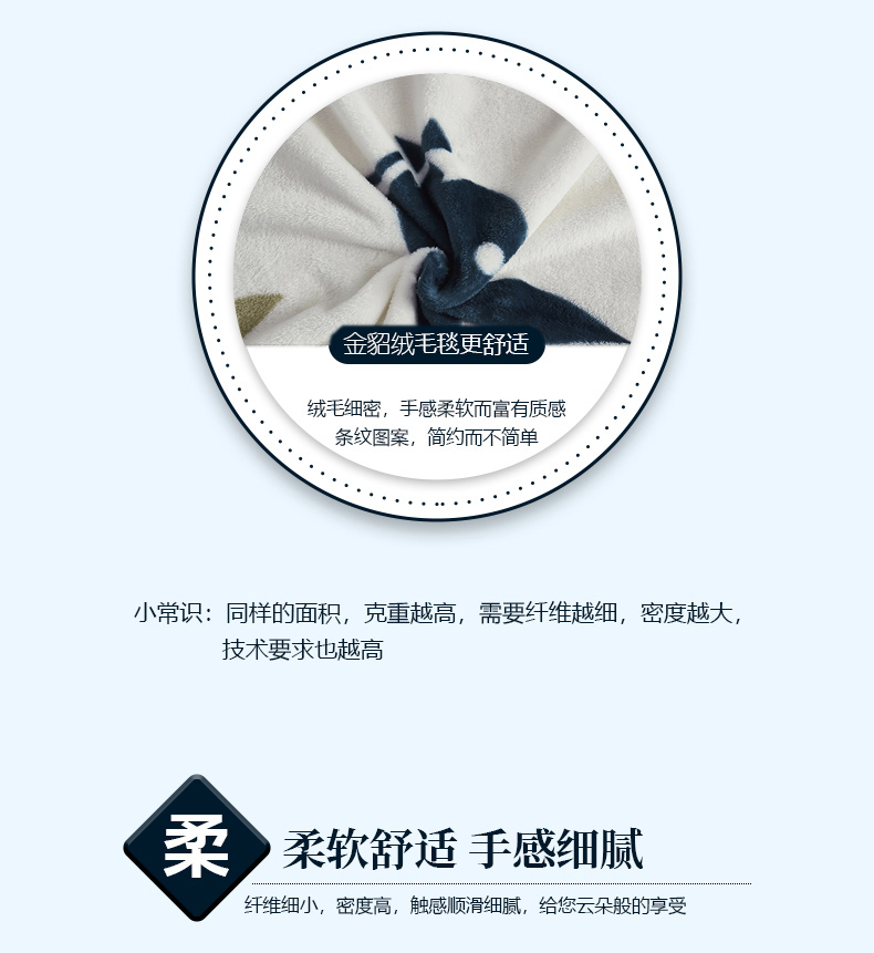 规格:150*200cm 面料:金貂绒 克重:900g 执行标准:FZ/T61002-2019 安全类别:GB18401-2010 B类 1.金貂绒柔软亲肤,绒毛舒适。蓄热保暖如春天般的温暖。面料经过无静电处理,健康舒适环保。同时采用绿色环保印染工艺,持久鲜艳;2.简约设计,使得毯子更显档次,更显时尚。精致的包边工艺,做工精细,针脚细密,不易脱线,牢固耐用。