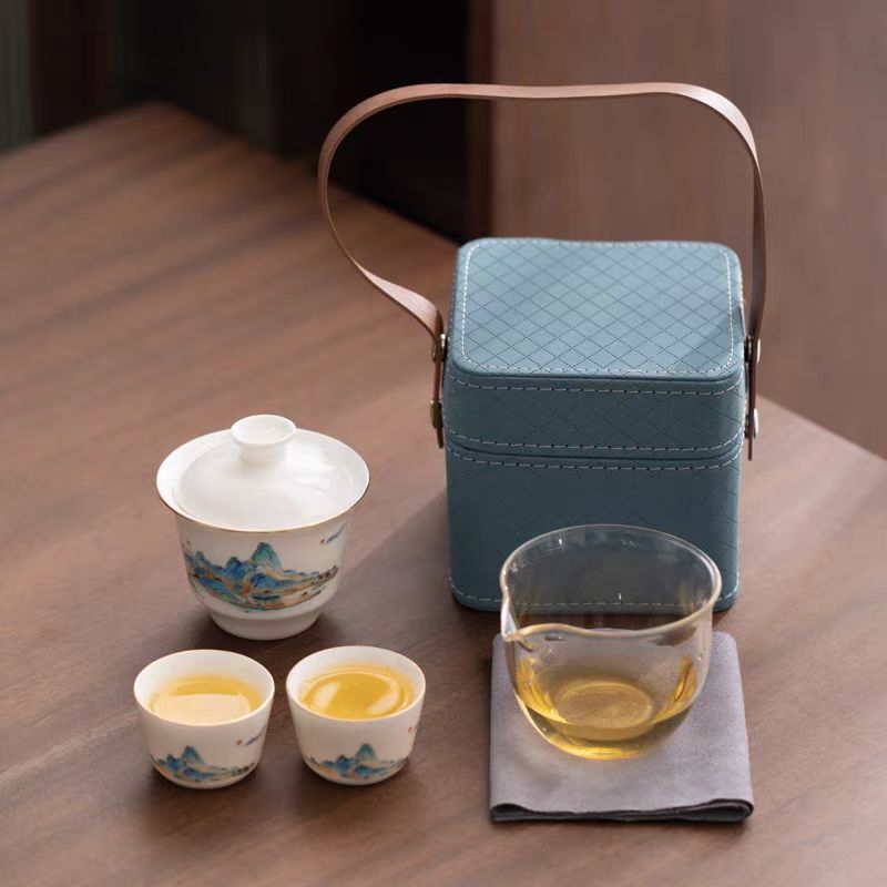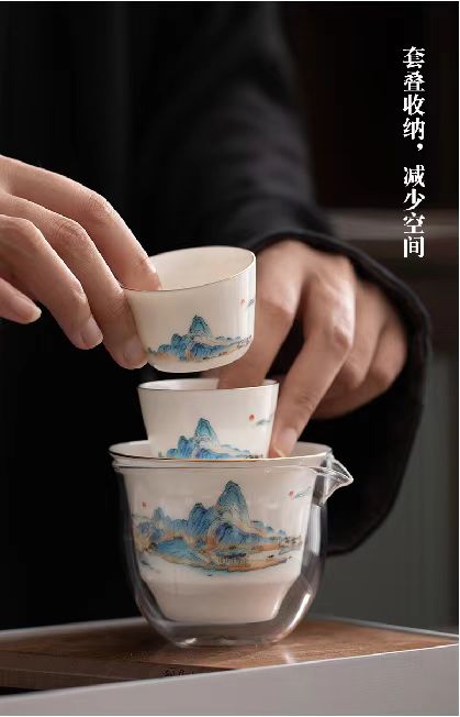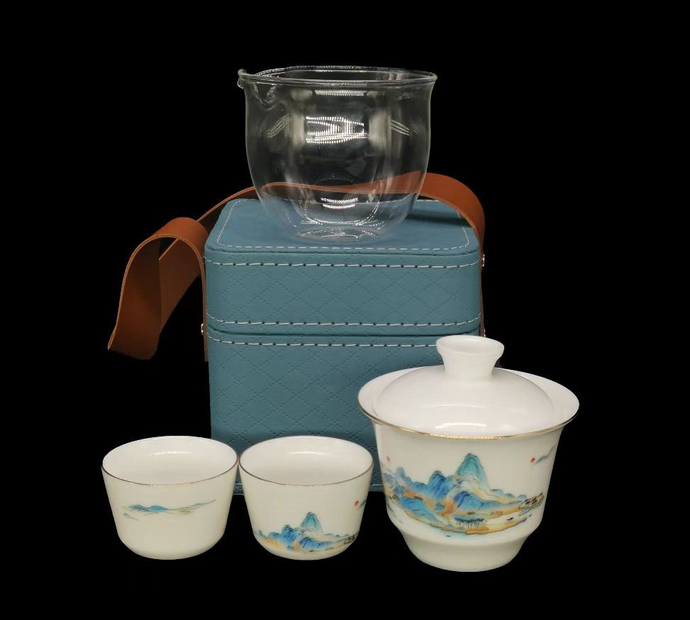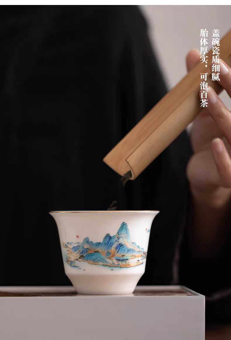 鹏翼千里江山描金羊脂玉瓷快客套装