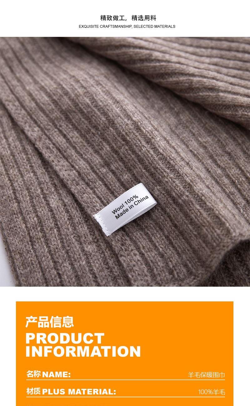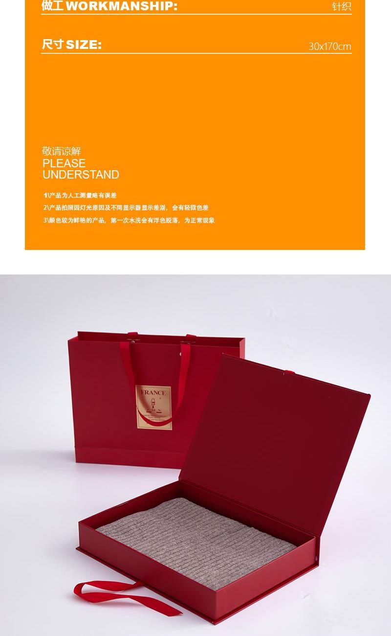 默认OPP袋包装,如需要礼盒装请与我们联系。 面料:羊毛 尺寸:30x170cm 卖点: 1、精选羊毛材质,保暖且吸湿排汗。 2、新工艺,不扎皮肤,不变型,舒适耐用。 3、可搭配精美礼盒。