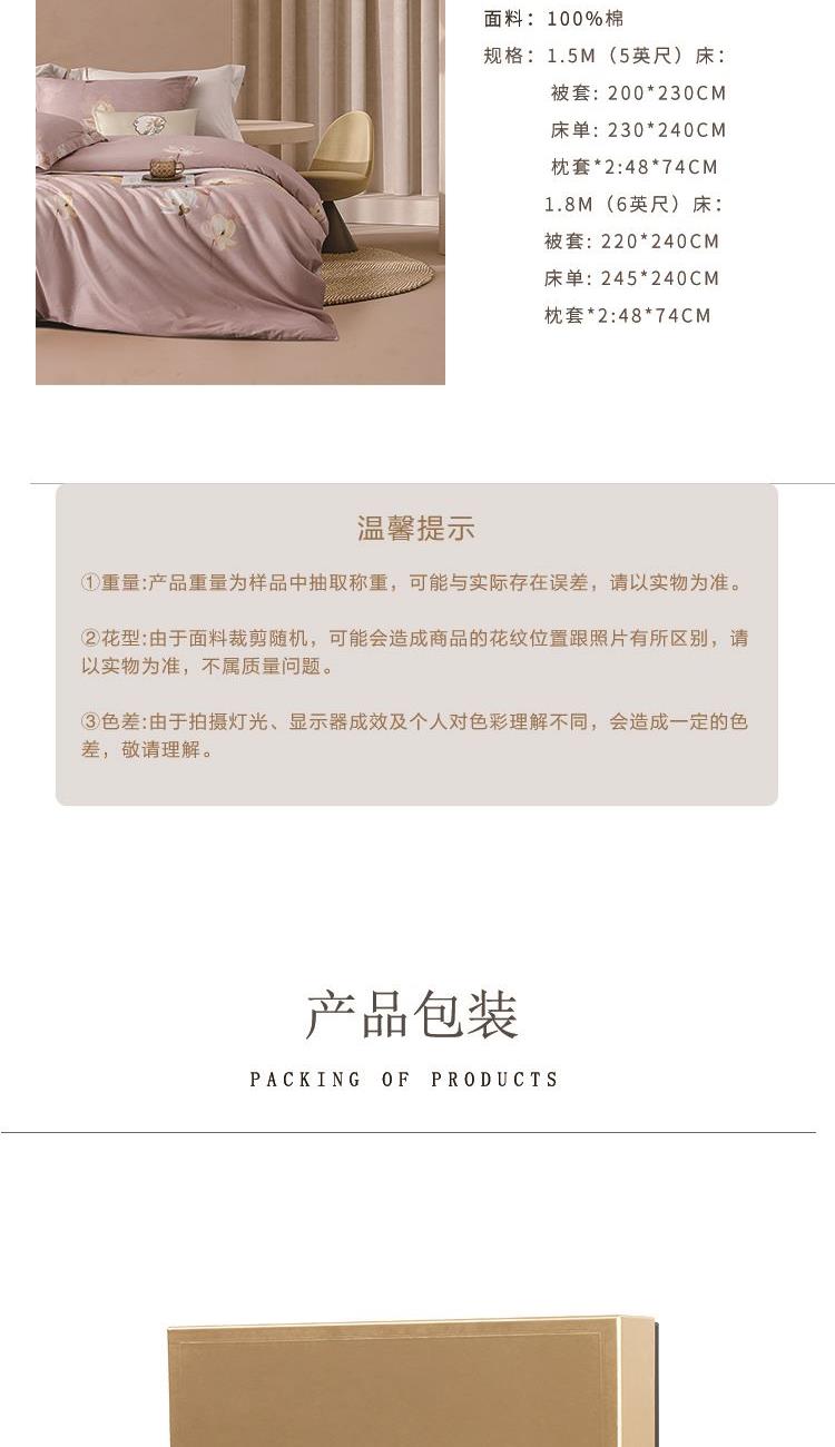 产品规格:1.8m(6英尺)床: 被套:220*240cm 床单:240*245cm 枕套*2:48*74cm 产品材质:棉 1、选用棉,优质印染工艺,手感细腻,AB面体验,保暖升级,无惧冬日严寒。 2、二次高柔磨毛工艺,保暖舒适不易压身,增加全棉面料的保暖性和舒适性,锁住热量,持久续暖。