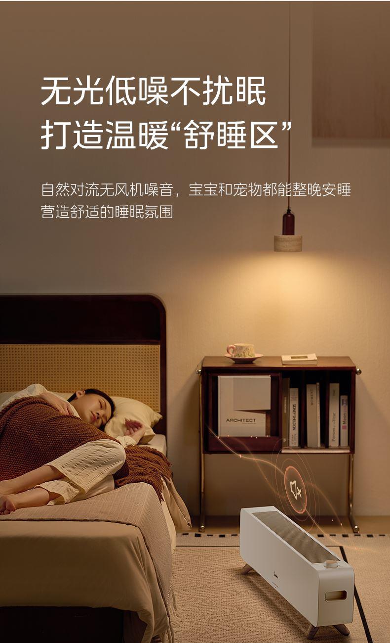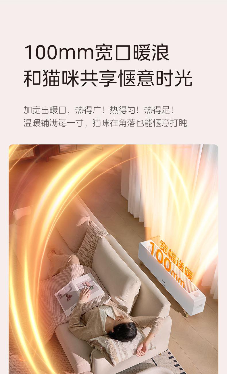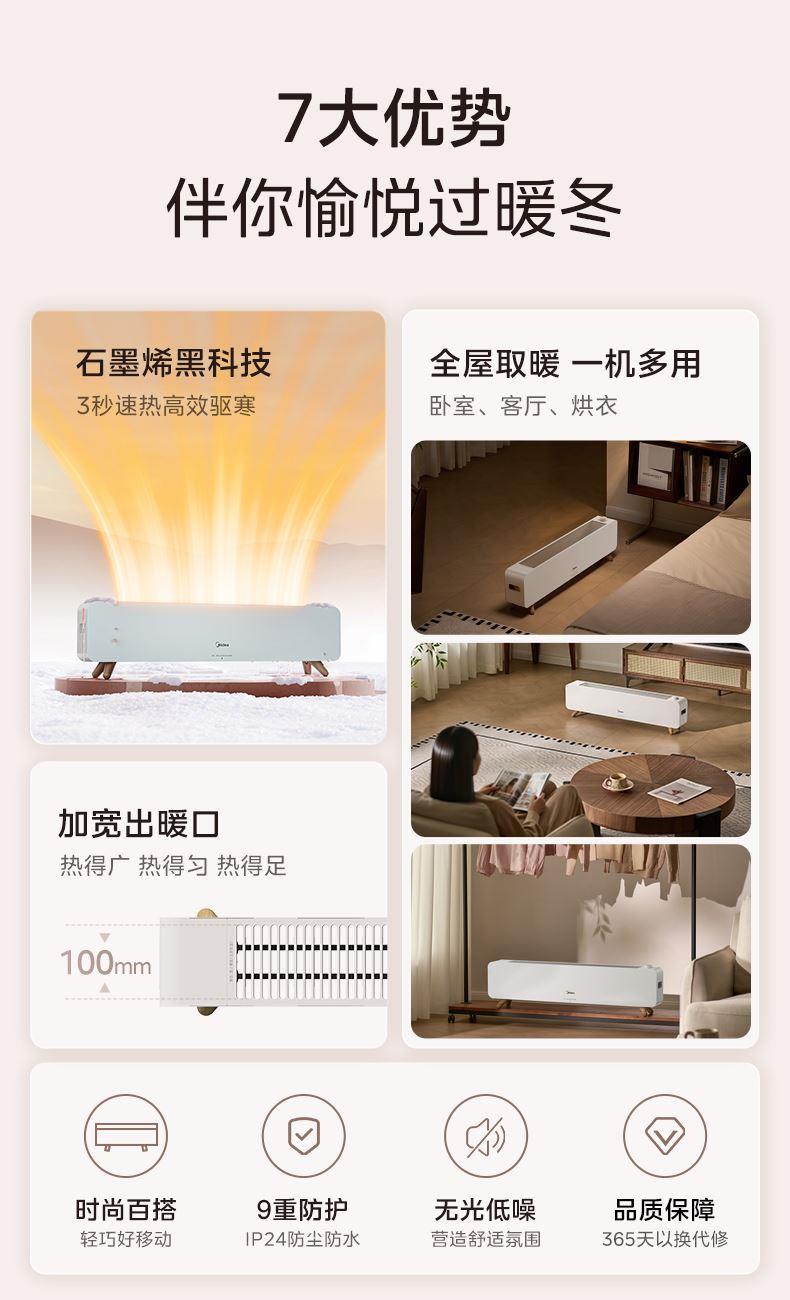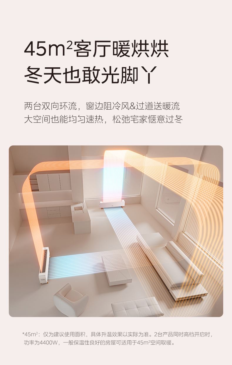 包装尺寸:1038 x 202 x 360 mm 商品尺寸:945 x 125 x 265 mm 毛重:5.8 kg 【温暖无需等待】 石墨烯速热“黑”科技,3秒快速释放热量。石墨烯热光波与人体同频,更容易被人体感知。温和舒适,如同冬日沐浴阳光一般; 加宽出暖口,充分散热,热量更足。出暖口加宽至100mm,对比老品增加22%; 【愉悦每个冬日场景】 卧室安静升温。无光低噪温和升温,搭配智能睡眠曲线,宝宝整晚安睡,不用担心踢被子着凉 快速烘衣暖衣。早上赖个床的时间,衣服暖了;晚上安静烘衣,第二天起床就有干衣服穿了 客厅均匀升温。2台一起用,一台放在窗边阻隔室外冷空气,一台放在客餐厅交界处,双向