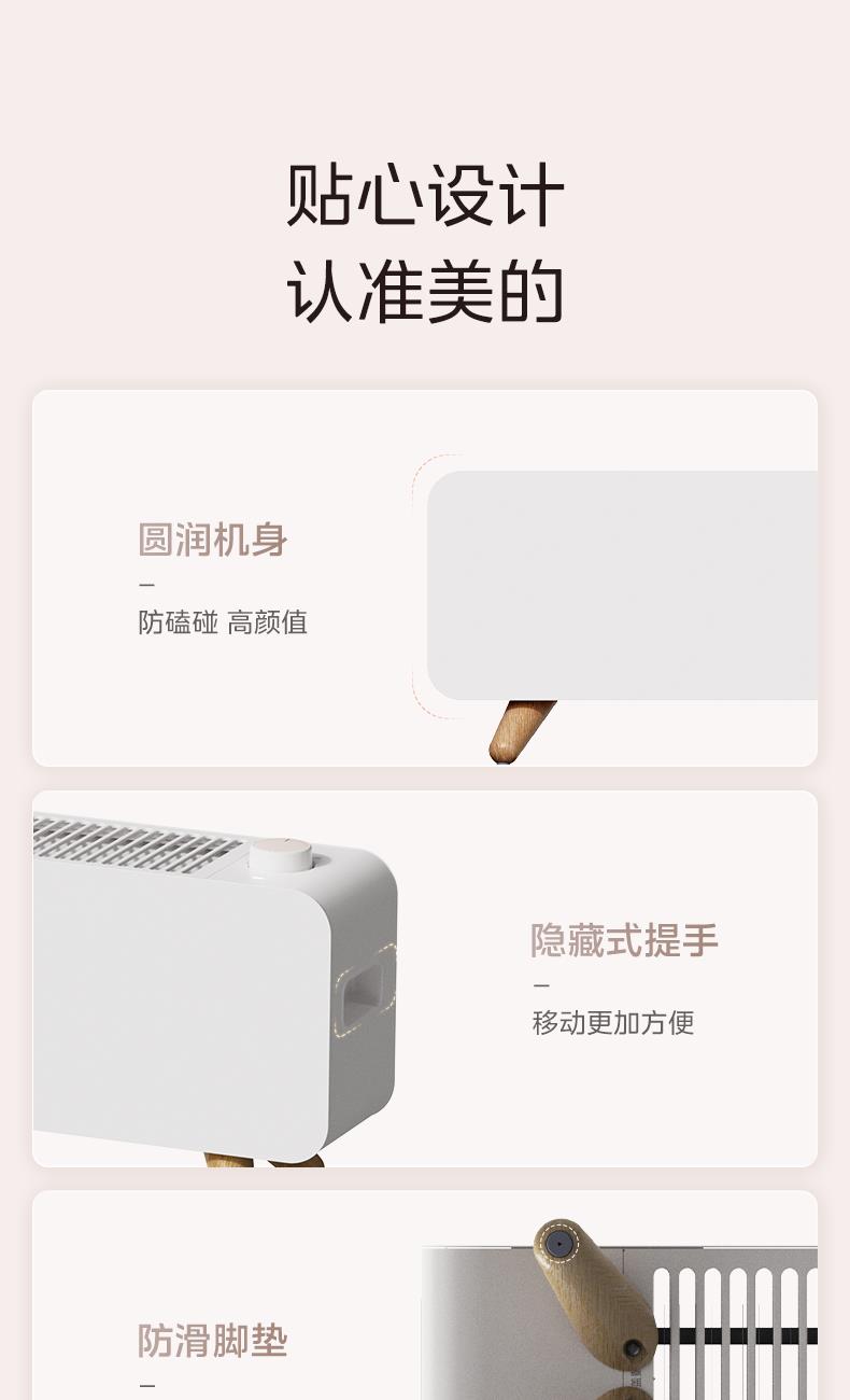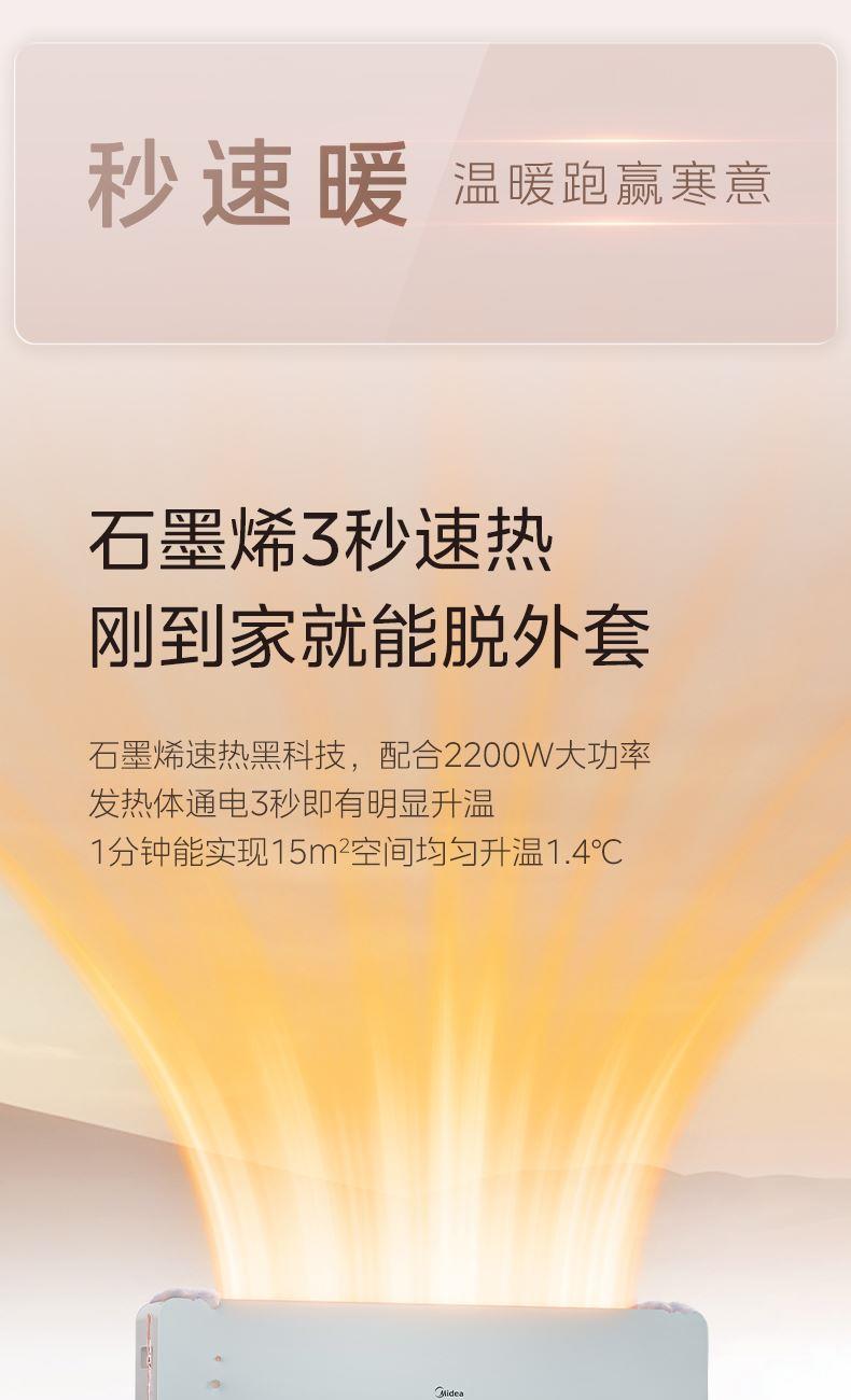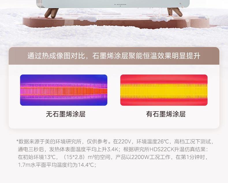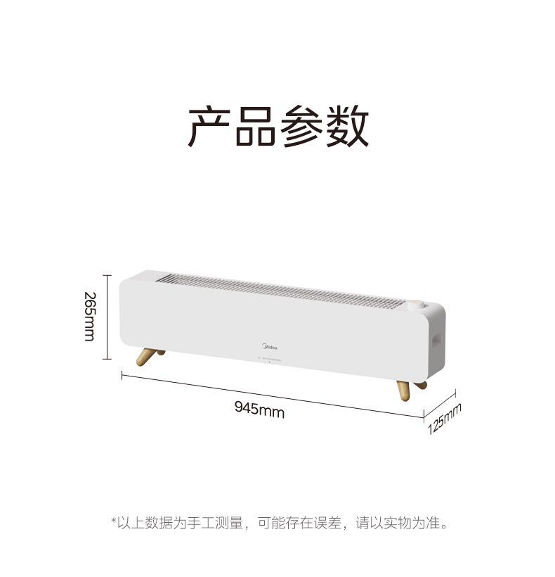 包装尺寸:1038 x 202 x 360 mm 商品尺寸:945 x 125 x 265 mm 毛重:5.8 kg 【温暖无需等待】 石墨烯速热“黑”科技,3秒快速释放热量。石墨烯热光波与人体同频,更容易被人体感知。温和舒适,如同冬日沐浴阳光一般; 加宽出暖口,充分散热,热量更足。出暖口加宽至100mm,对比老品增加22%; 【愉悦每个冬日场景】 卧室安静升温。无光低噪温和升温,搭配智能睡眠曲线,宝宝整晚安睡,不用担心踢被子着凉 快速烘衣暖衣。早上赖个床的时间,衣服暖了;晚上安静烘衣,第二天起床就有干衣服穿了 客厅均匀升温。2台一起用,一台放在窗边阻隔室外冷空气,一台放在客餐厅交界处,双向
