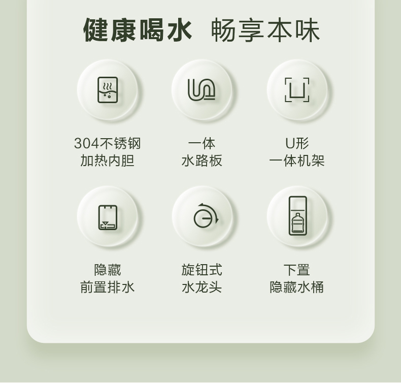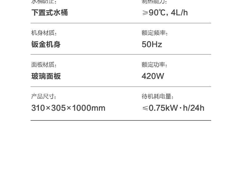 产品尺寸:310x305x1000mm 包装尺寸:370x370x1106mm 毛重:12.4kg 304不锈钢,加热内胆; U形一体机架; 隐藏前置排水; 下置隐藏水桶; 一体水路板;