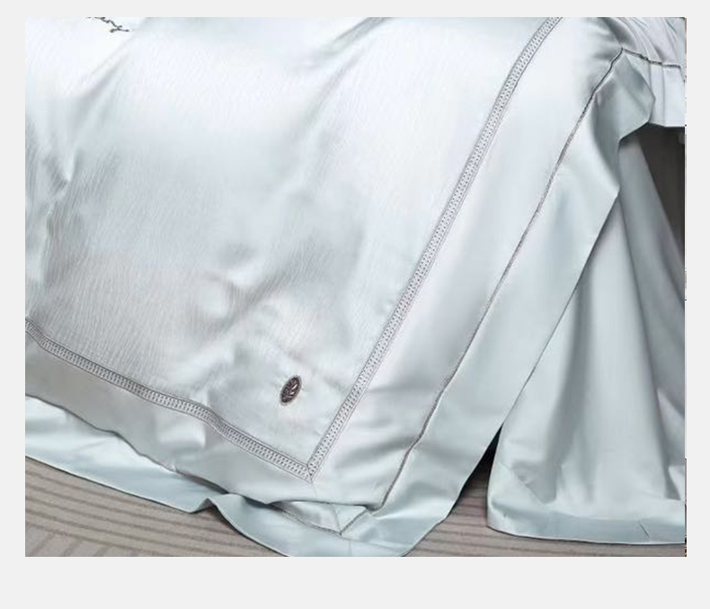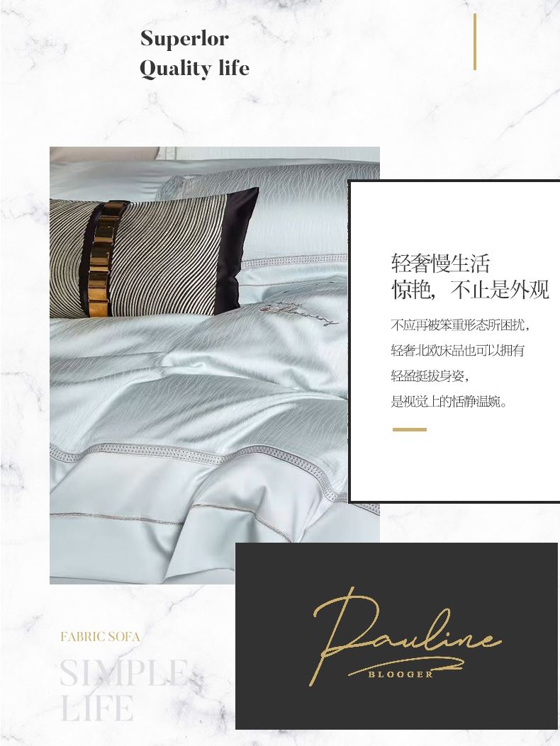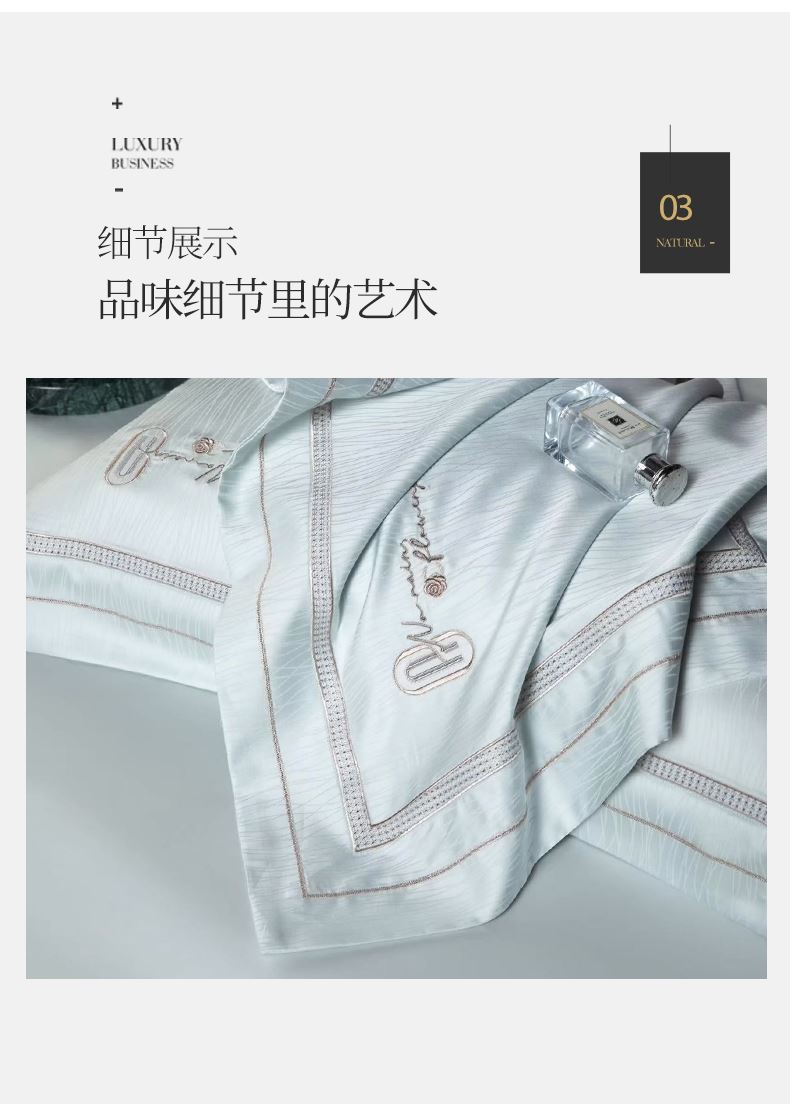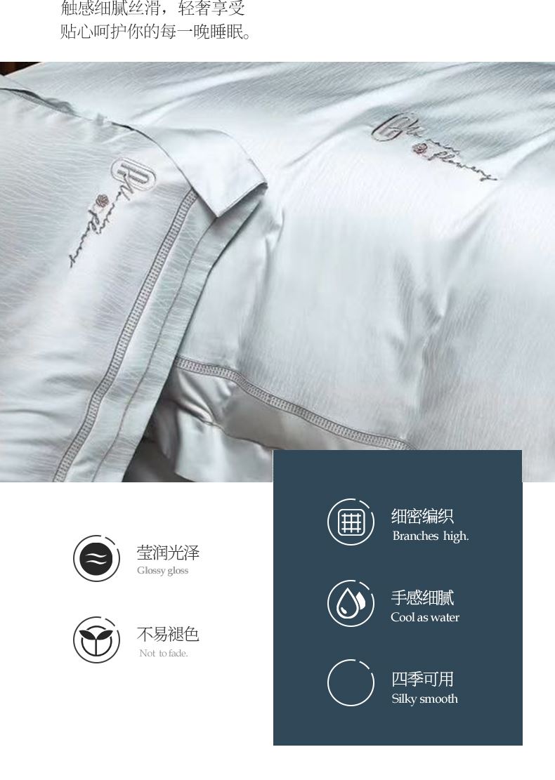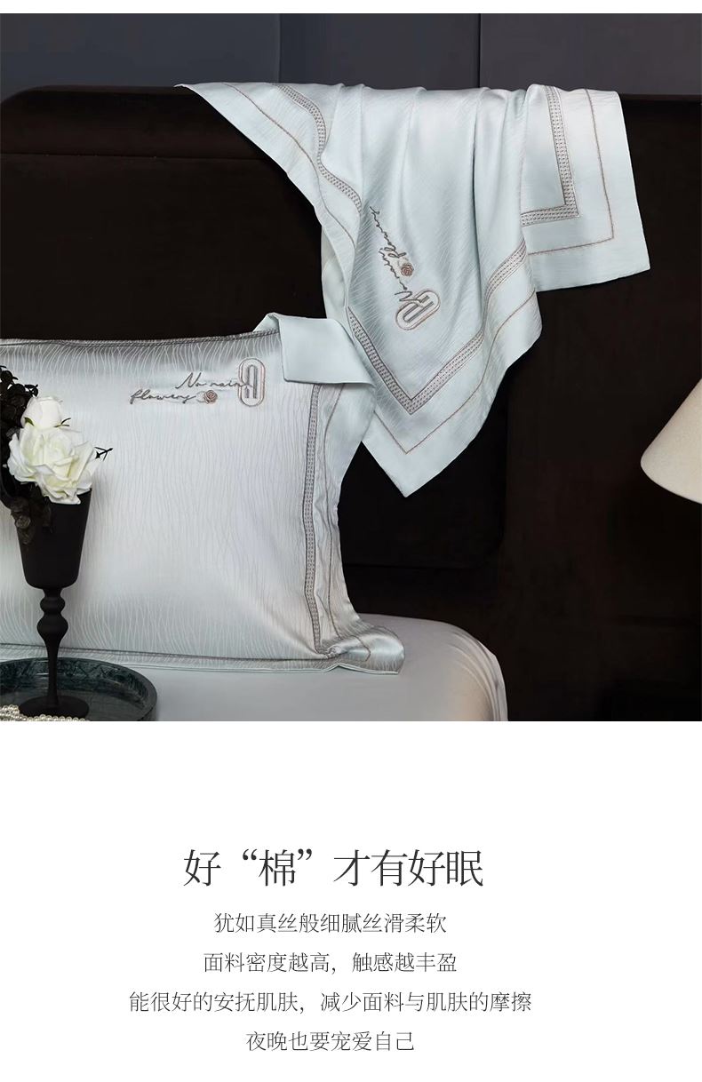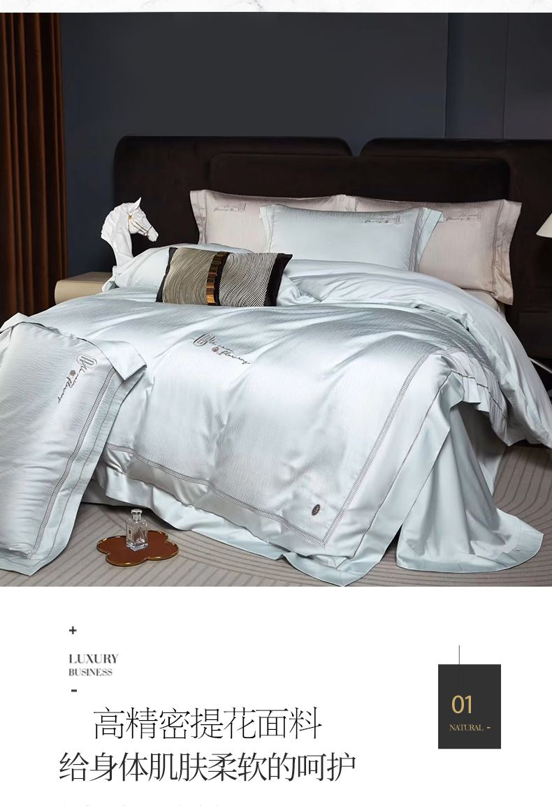 被套:200*230cm 床单:245*250cm 枕套:48*74cm*2 面料:高精密提花(聚酯纤维) 执行标准:GB/T22796-2021 安全类别:GB18401-2010 B类 天丝是自然界的绿色纤维,是从校树中提取木浆为原料,赋予了织物以柔滑的触感和美妙的光泽,丝滑柔滑的全新享受。 从木材中萃取出来织成的纺品轻薄透气,柔滑垂顺,被誉为“会呼吸的面料
