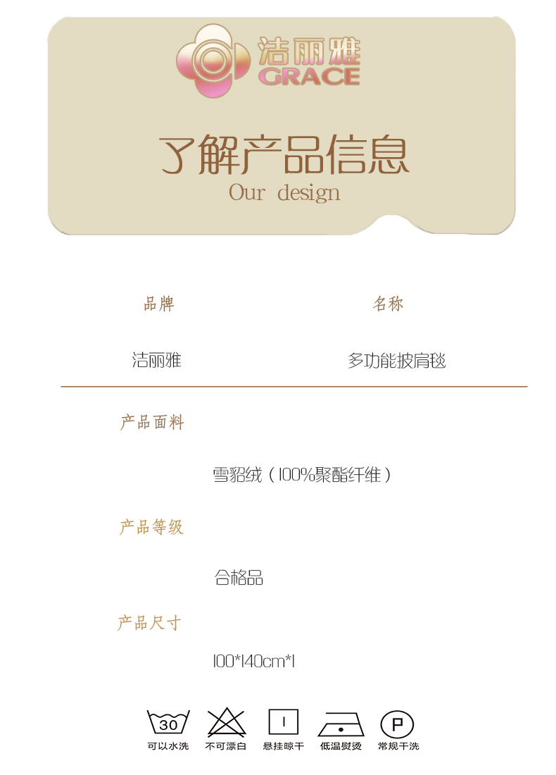 货号:JLY-C705 面料:雪貂绒 尺寸:100*140cm*1 重量:400g 执行标准:FZ/T61002-2019 安全类别:GB18401-2010 B类 这是一款可以做衣服的毯子,采用柔软保暖的婴儿绒面料。容易被忽略的上半身,手臂,肩部,颈部,背部,一件搞定,创意空调披肩小毯子,她可系,可披,易收纳,爱她营造的专属你我的温暖港湾。