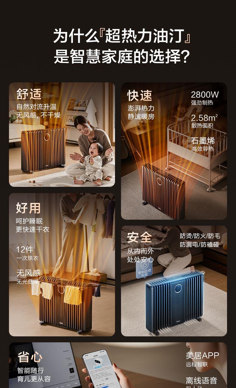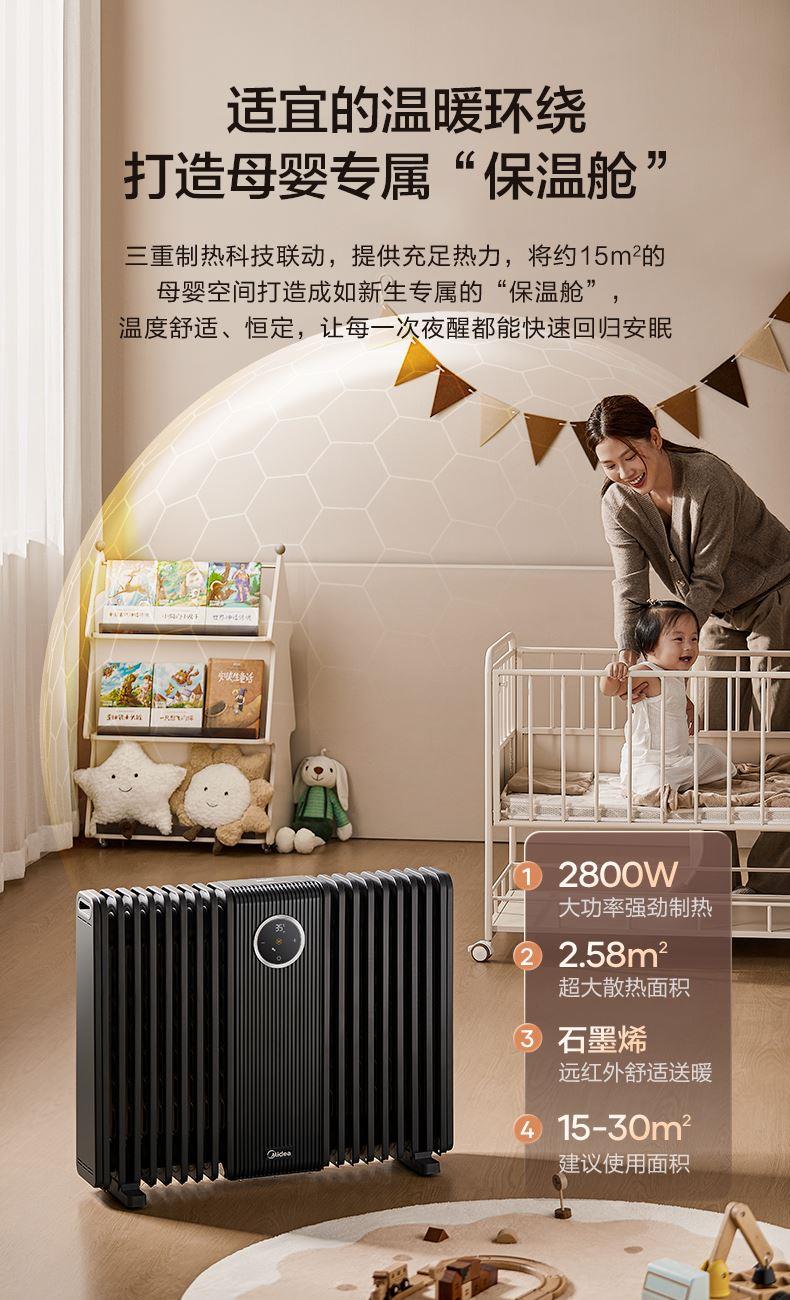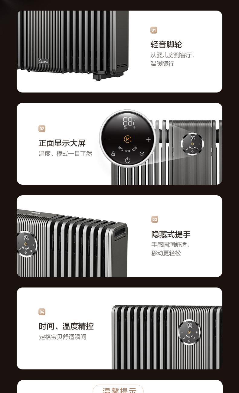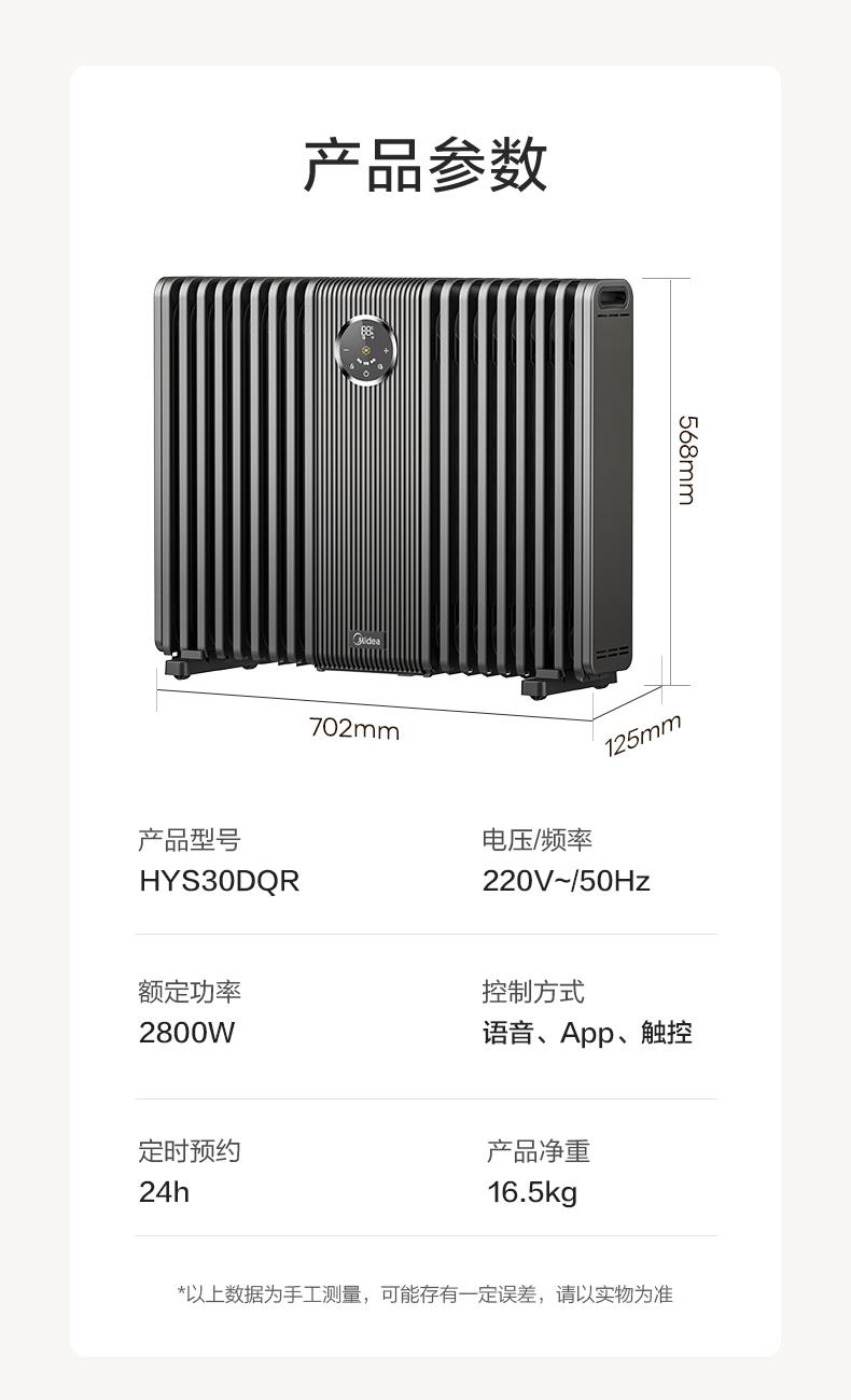包装尺寸:962 x 205 x 699 mm 商品尺寸:702 x 125 x 568 mm 毛重:19 kg 【温和升温】 告别干燥强风!油汀通过温和的对流方式均匀加热空气,如同阳光般自然舒适。同时升温过程细腻柔和,有效维持室内空气湿度,避免直吹导致宝宝肌肤干燥、呼吸道不适
