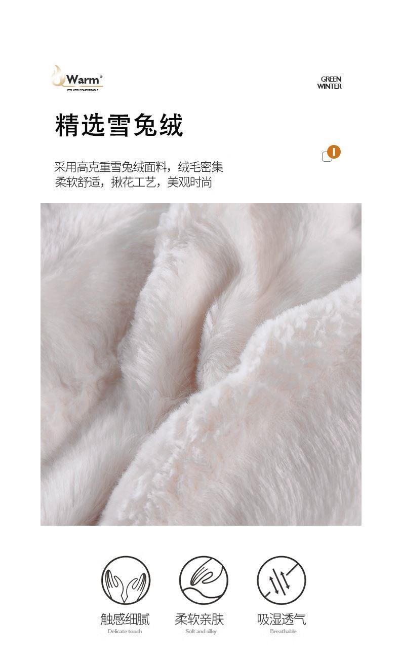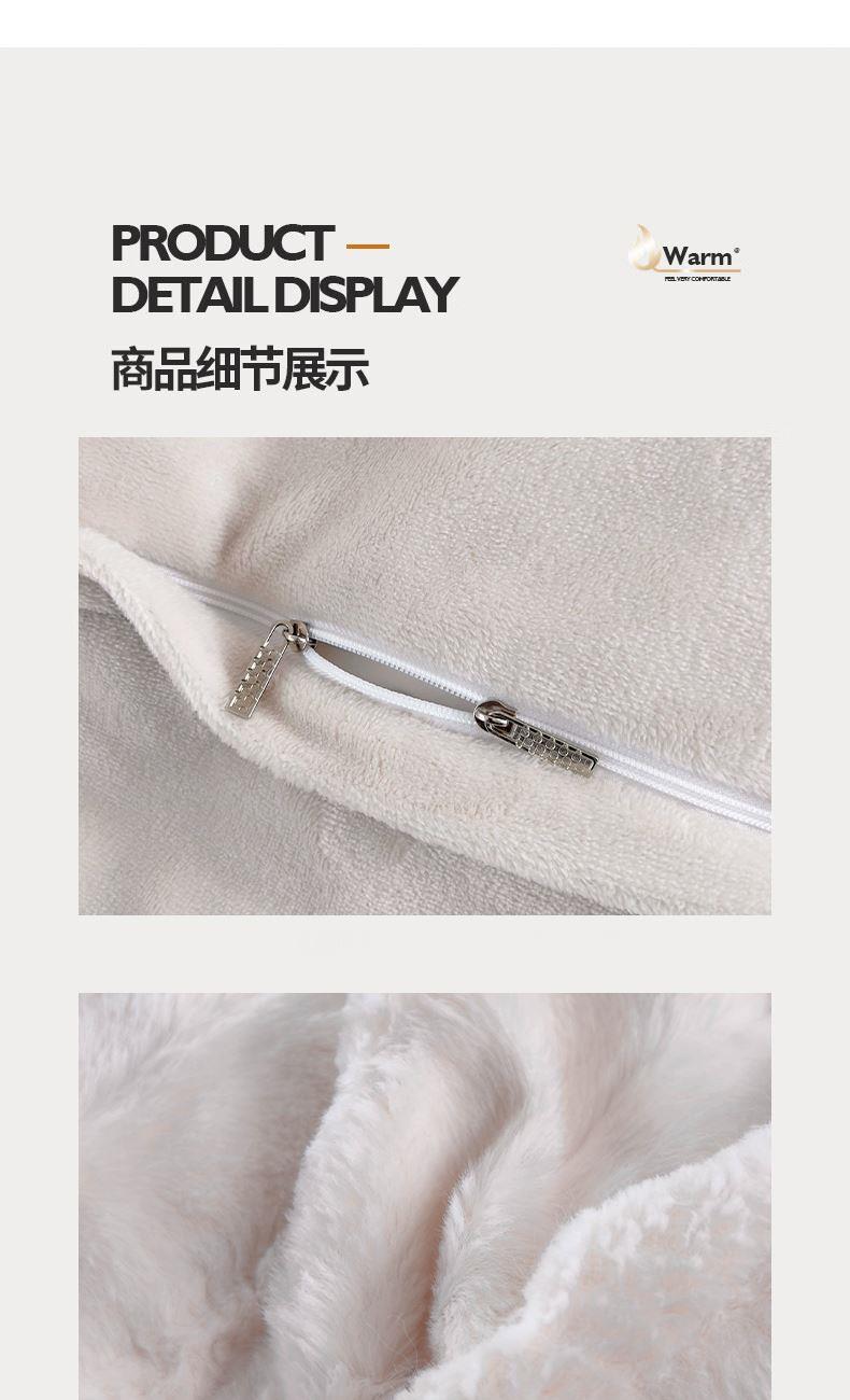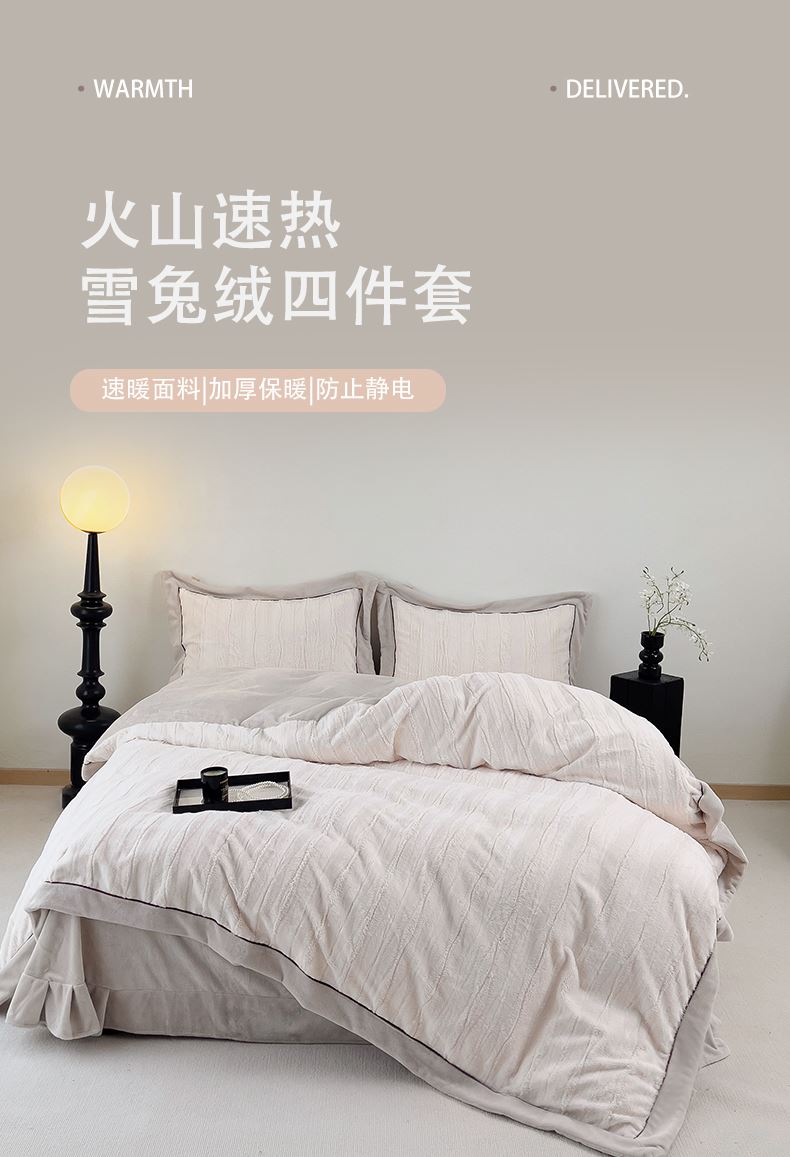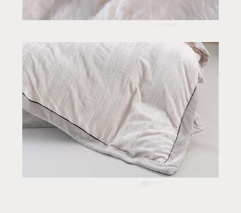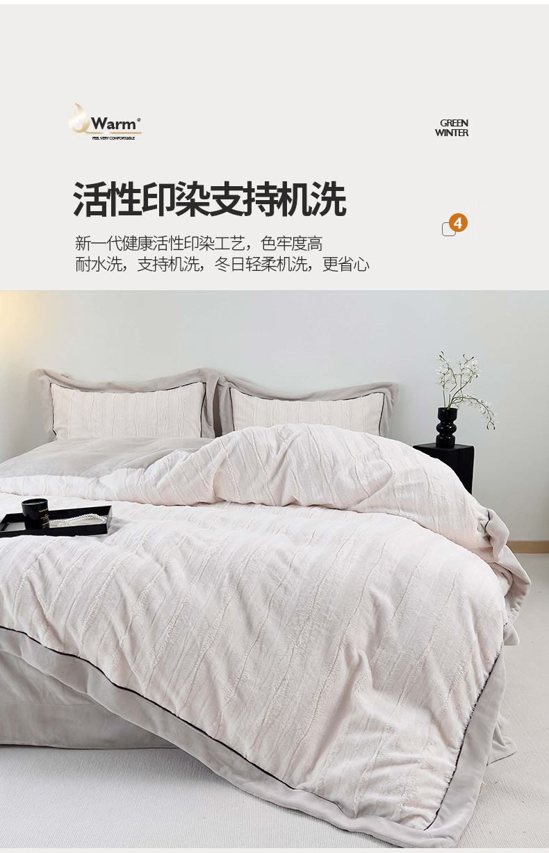 被套:200*230cm 床单:250*250cm 枕套:48*74cm*2 面料:雪兔绒 执行标准:GB/T22796-2021 安全类别:GB18401-2010 B类 1.采用雪兔绒面料,表层绒毛细密软糯,触感舒适;牛奶绒面料纤维较小密度高,表面平滑细密,更保暖。2.内置导电纱,防静电处理,使用更安心。3.简约设计,使得毯子更显档次,更显时尚。精致的包边工艺,做工精细,针脚细密,不易脱线,牢固耐用。