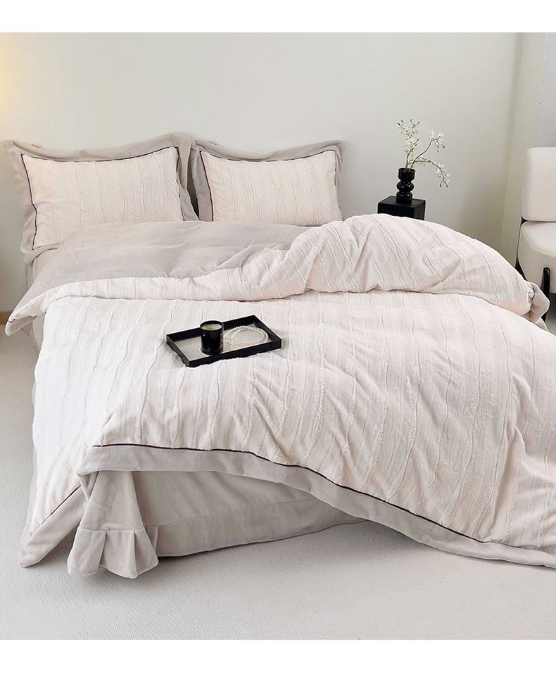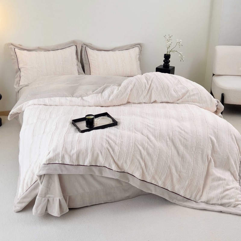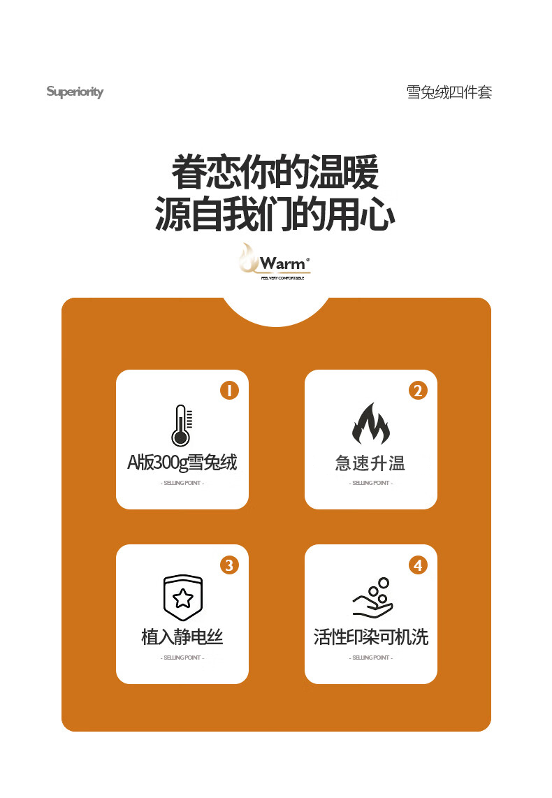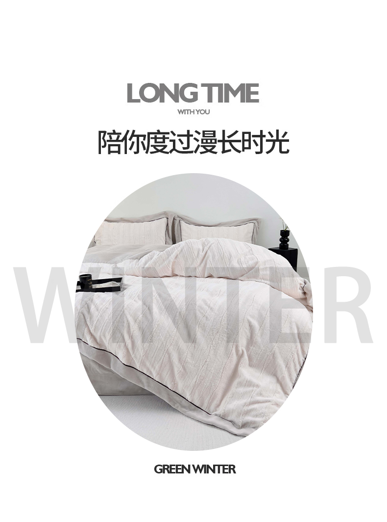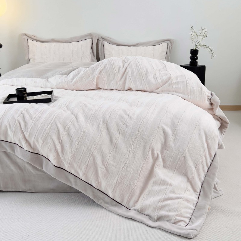 被套:200*230cm 床单:250*250cm 枕套:48*74cm*2 面料:雪兔绒 执行标准:GB/T22796-2021 安全类别:GB18401-2010 B类 1.采用雪兔绒面料,表层绒毛细密软糯,触感舒适;牛奶绒面料纤维较小密度高,表面平滑细密,更保暖。2.内置导电纱,防静电处理,使用更安心。3.简约设计,使得毯子更显档次,更显时尚。精致的包边工艺,做工精细,针脚细密,不易脱线,牢固耐用。