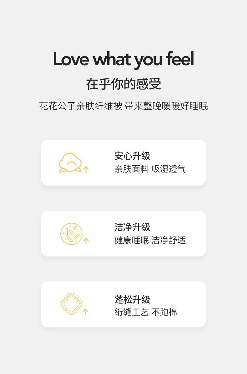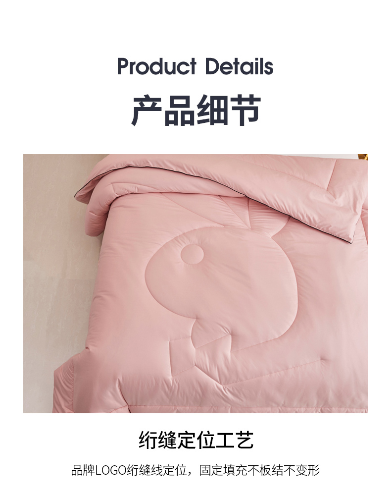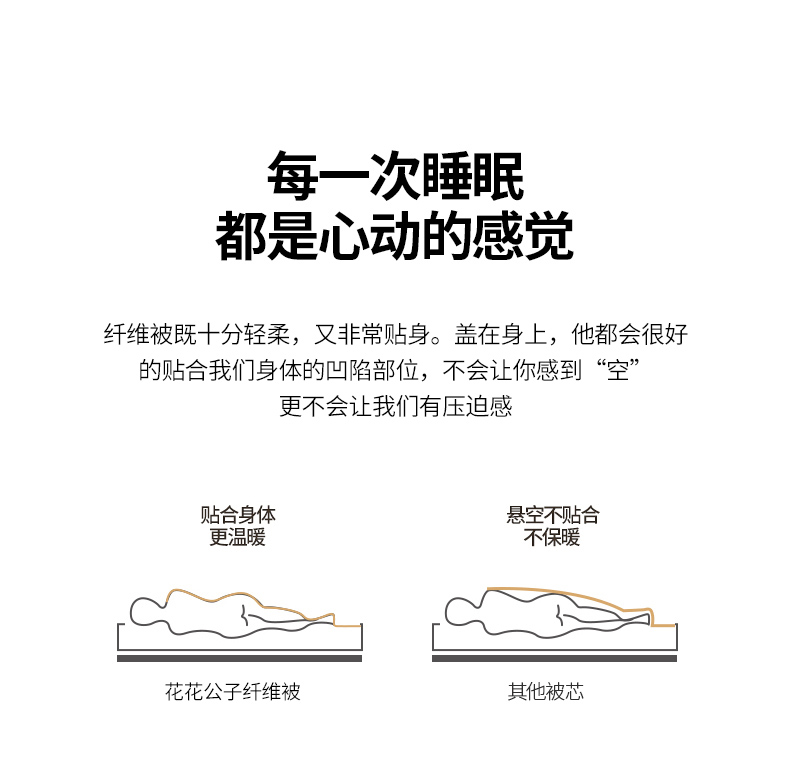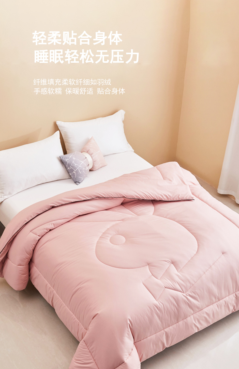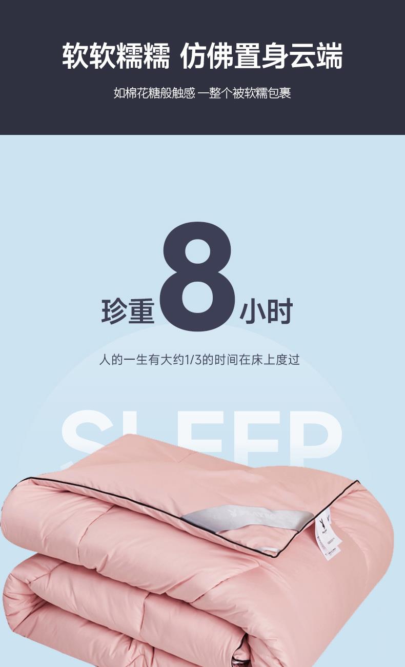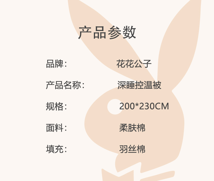 规格:200*230cm 面料: 柔肤棉 填充: 羽丝棉 重量:2000g 执行标准:GB/T22796-2021 安全类别:GB18401-2010 B类 1.柔软柔肤棉面料,亲肤透气,千爽透气贴着身体,仿佛会呼吸,越睡越上瘾。软软糯糯很亲肤,织造紧密,手感柔软 2.非湿排热内芯,不再闷湿燥热,内部形成多孔的中空结构,加速排出湿气和热量。