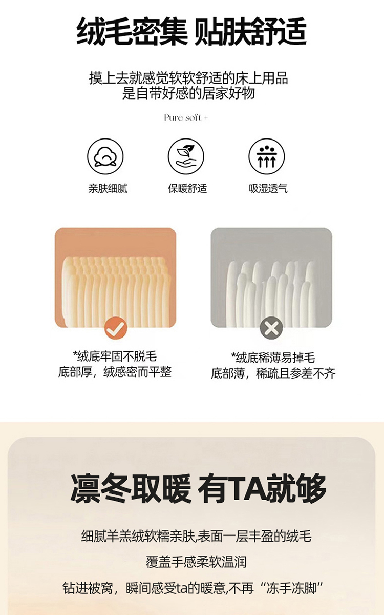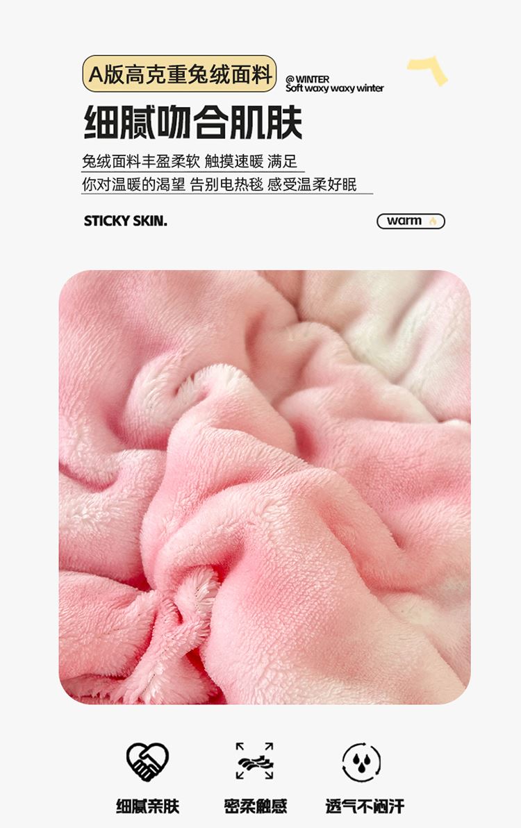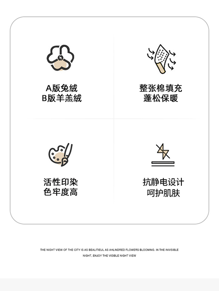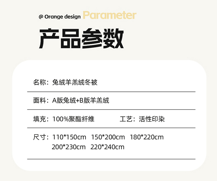 1:畅享舒睡时光欠绒感守护温暖加倍 兔绒+羊羔绒冬被系列 2:无拘无束的体感迎接了暖冬的到来 只一眼怦然心动·唤醒暖冬 3:羽丝棉填充盖在身上轻盈自在 良好的吸湿透气性,使整张被芯更加柔软细腻 尺寸:200*230cm 重量:约3kg 面料:A版兔毛绒B版羊羔绒 包装:礼盒或者礼袋