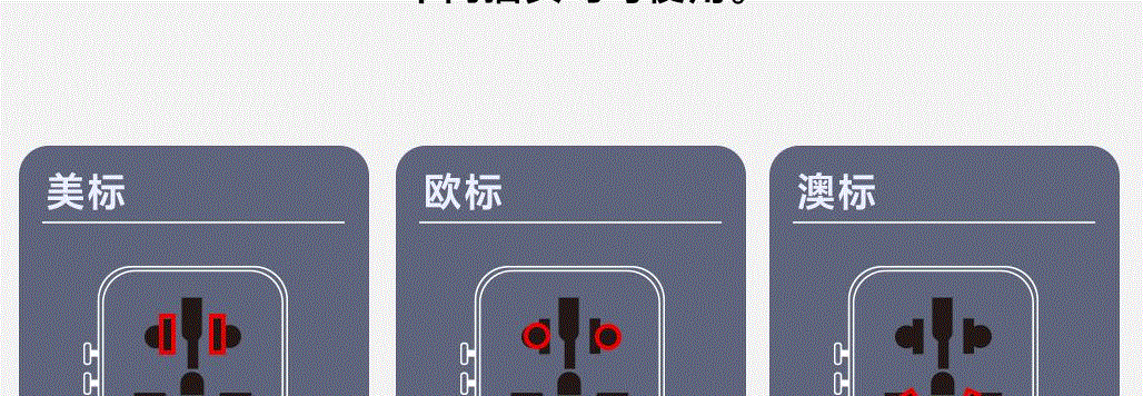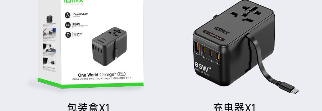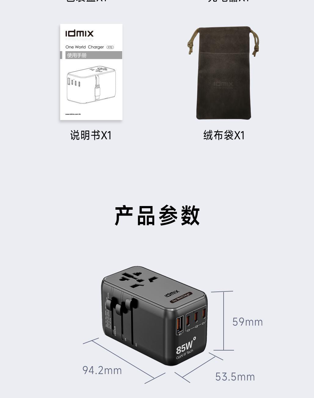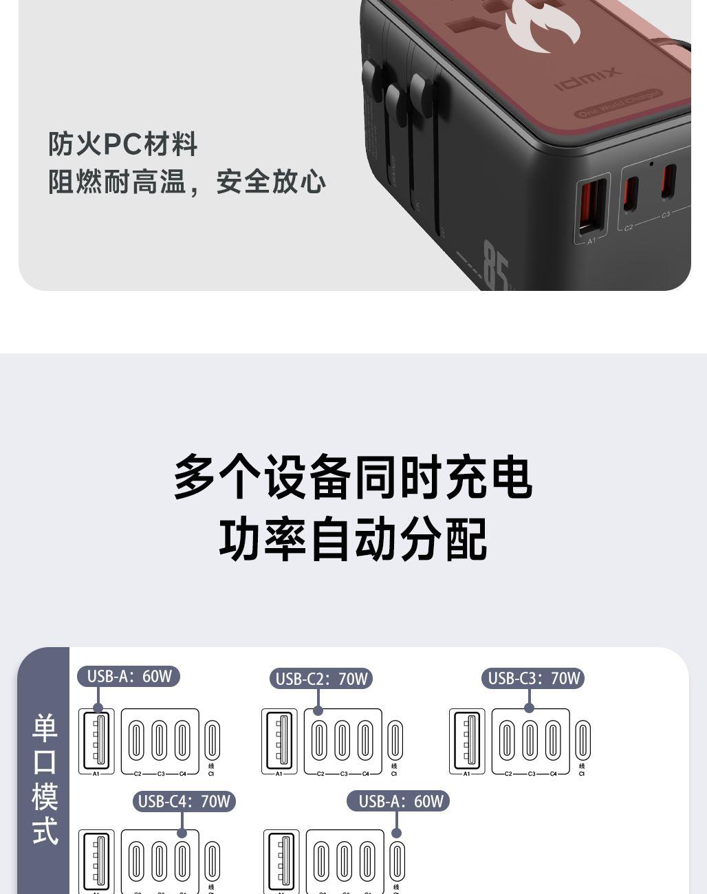 100V-250V宽电压设计,各国标准插头集成一体,轻松按推切换,三口85W快充 全球差旅充电一个就够