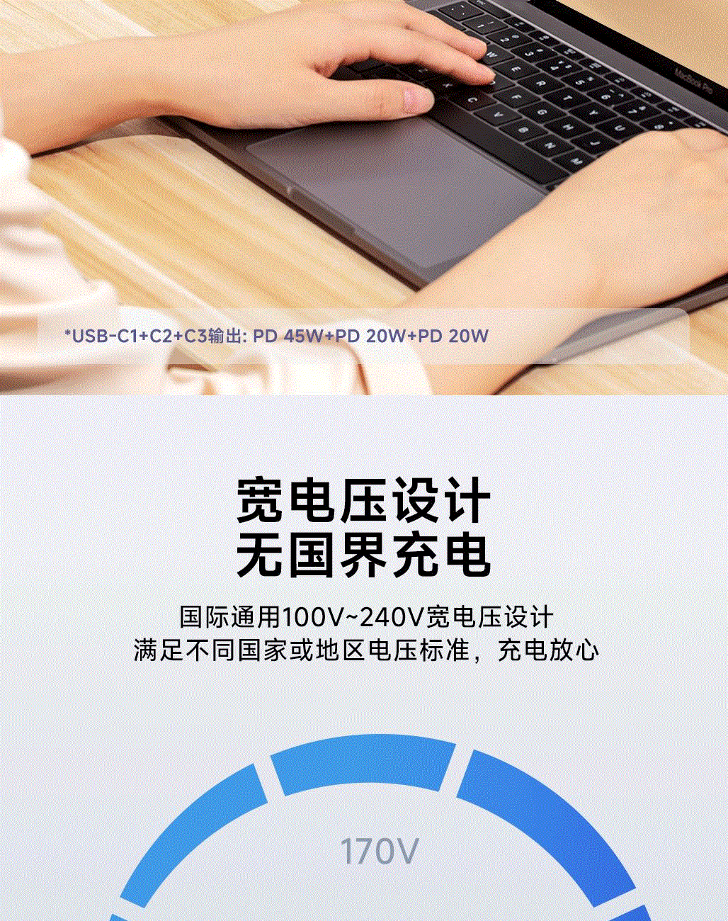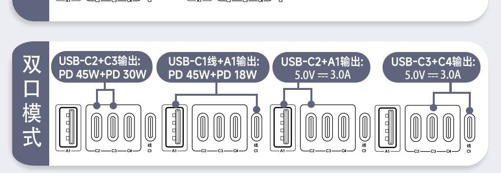 五口充电AC+USB-A+3*USB-C,USB-C支持PD70W,USB-C1+C2+C3同时输出,支持PD85W飚速快充,可为笔记本、平板电脑、手机等多种设备充电,多个设备同时充电,功率自动分配