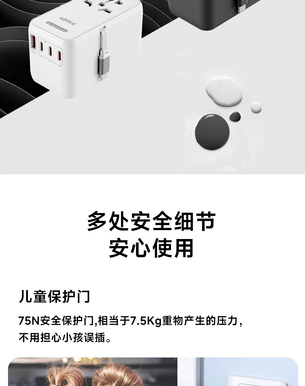 防火PC材料,阻燃耐高温,安全放心,75N安全保护门,相当于7.5Kg重物产生的压力,不用担心小孩误插