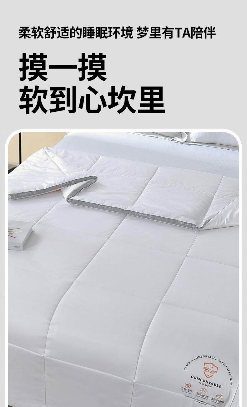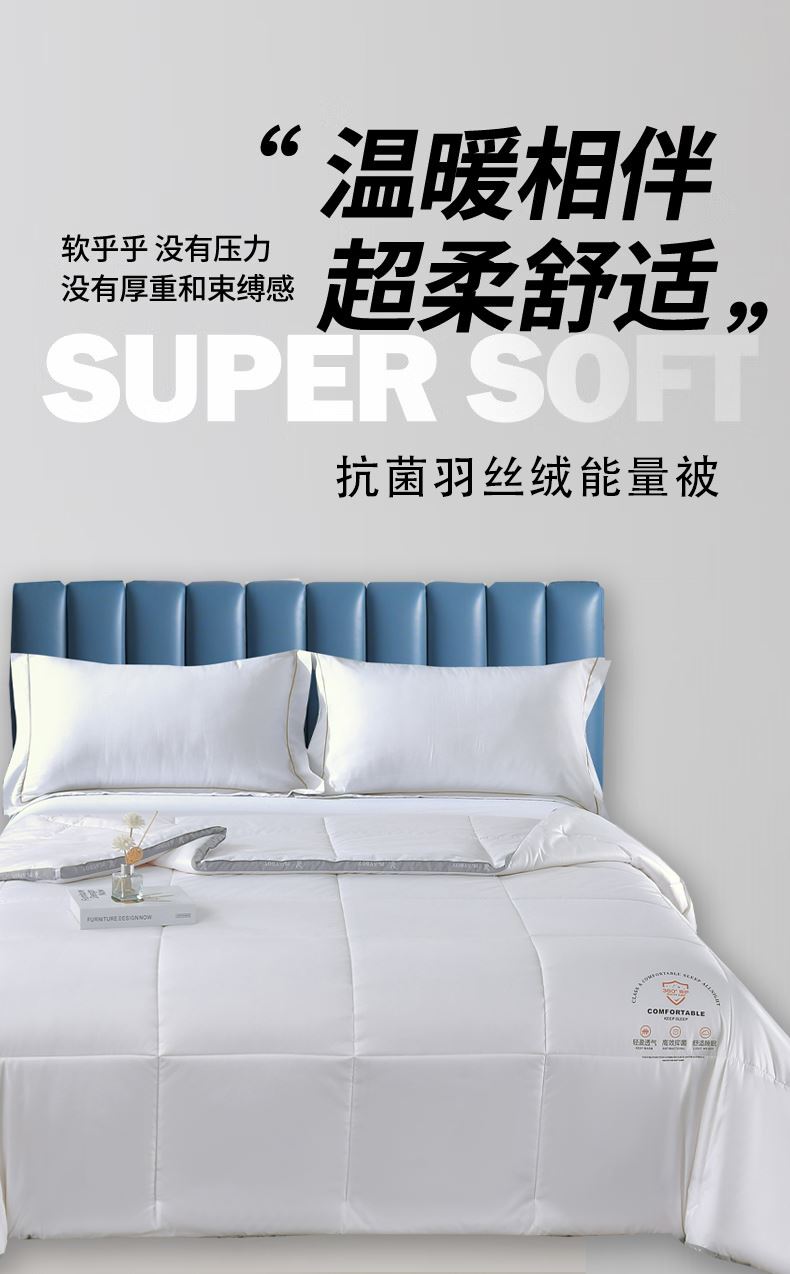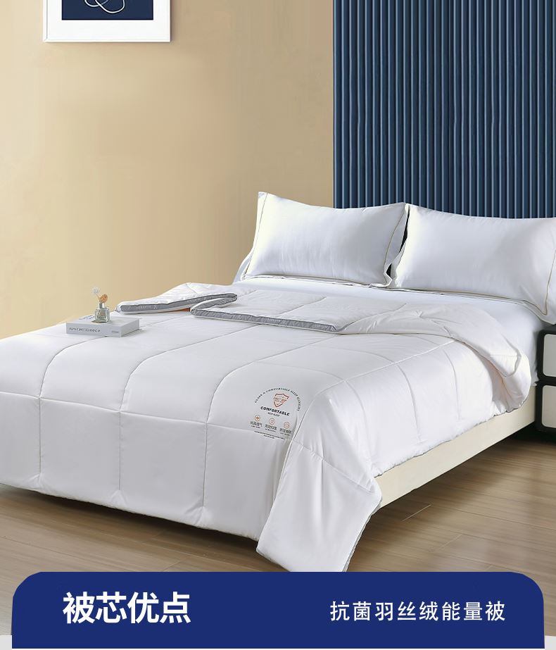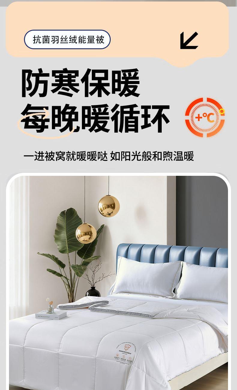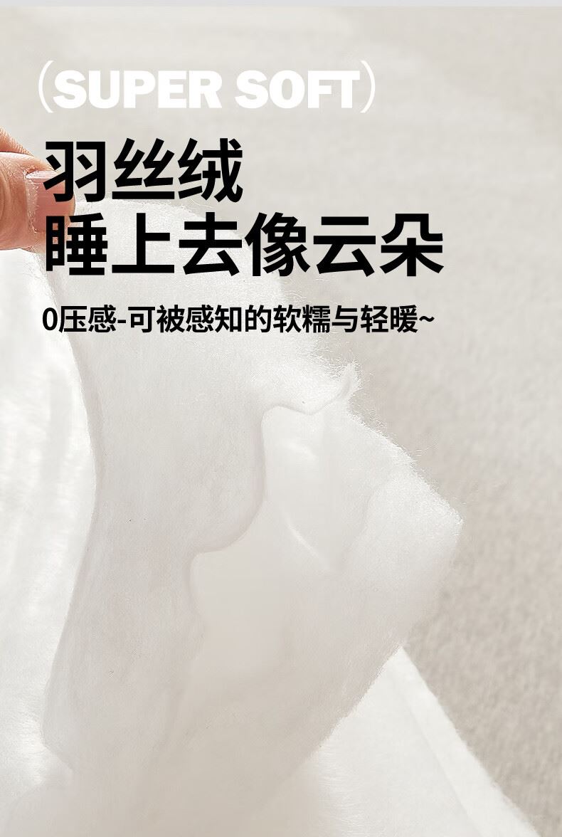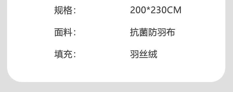 规格:200*230cm 面料: 防羽布 填充: 羽丝绒 重量:2800g 执行标准:GB/T22796-2021 安全类别:GB18401-2010 B类 1.甄选珠光棉面料,手感软糯细腻,珠般光泽,软糯厚实不起球; 2.黄金羽丝绒填充,纤维紧密锁定空气,产生稳定空气层,锁温保暖; 3.3D立体航空舱绗缝设计,立体立衬分区,保持被芯的高弹蓬松,不易变形。