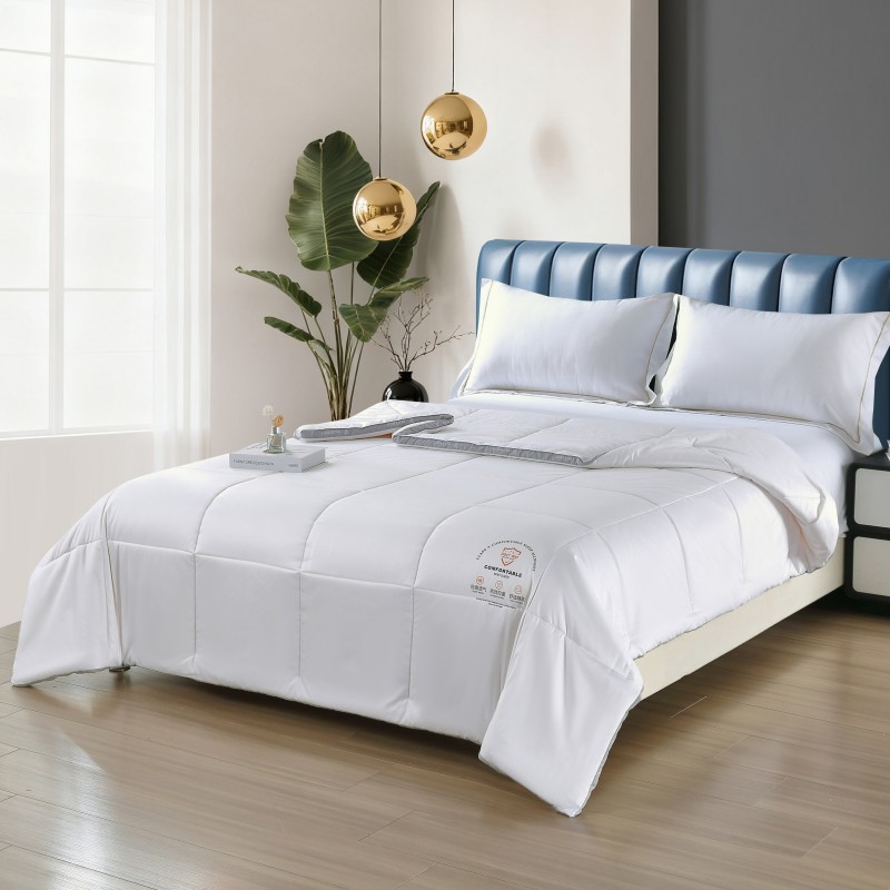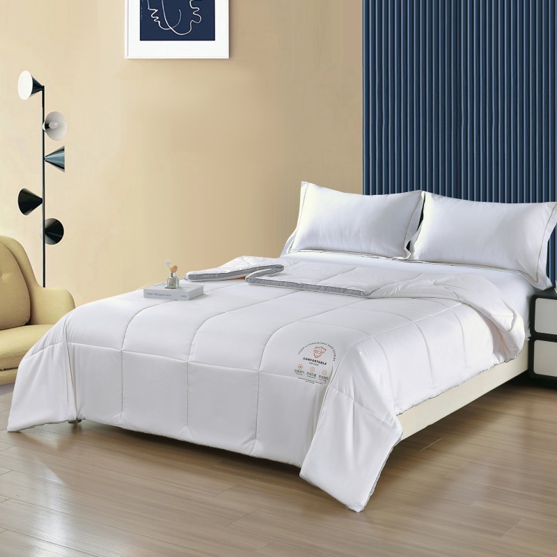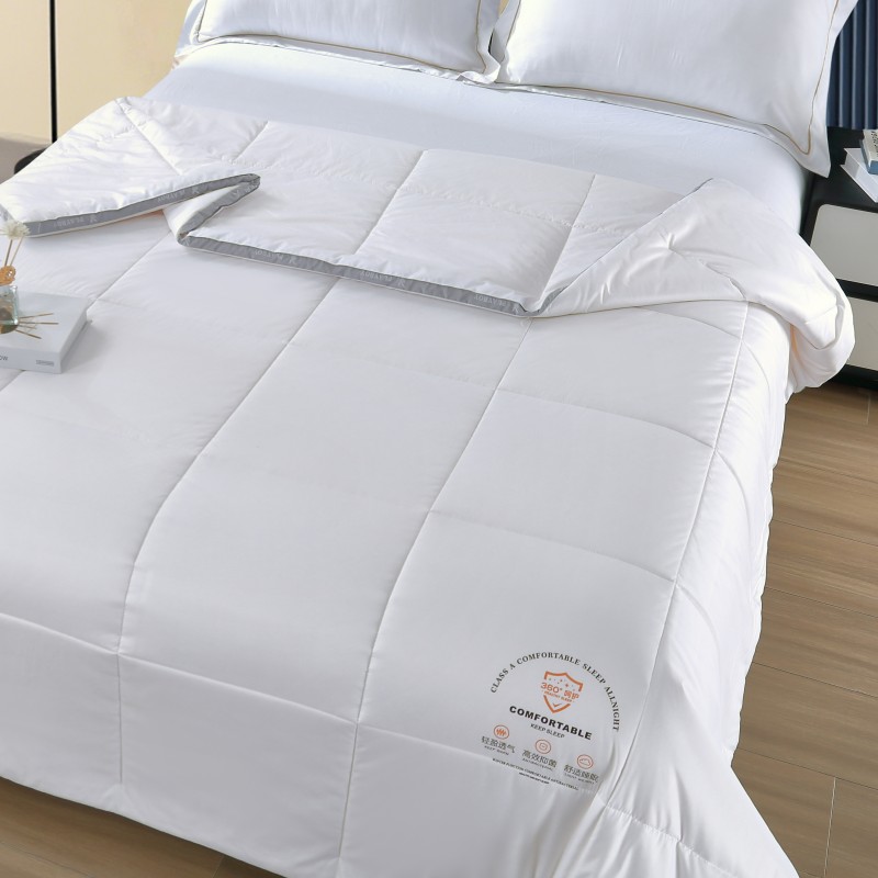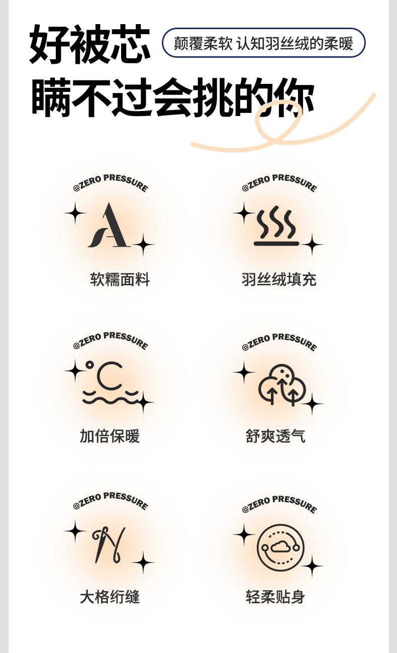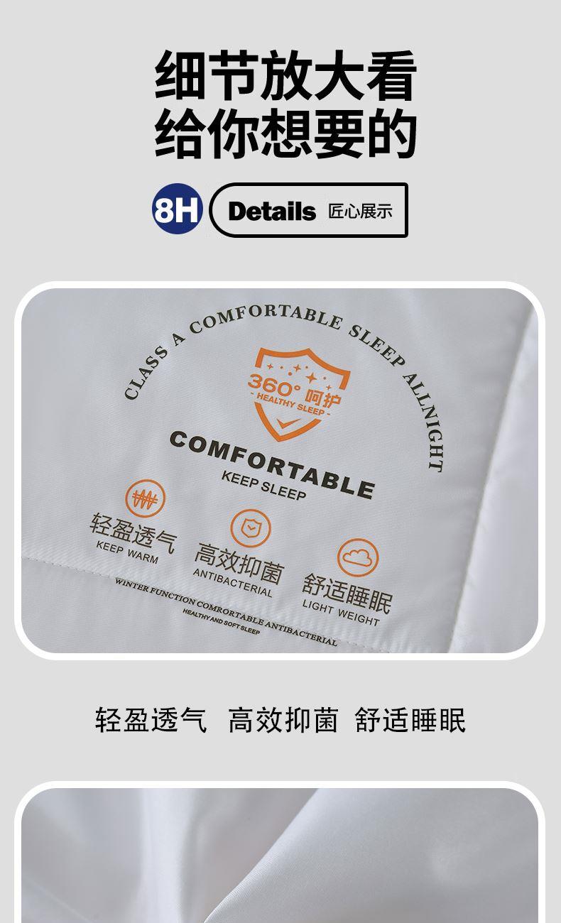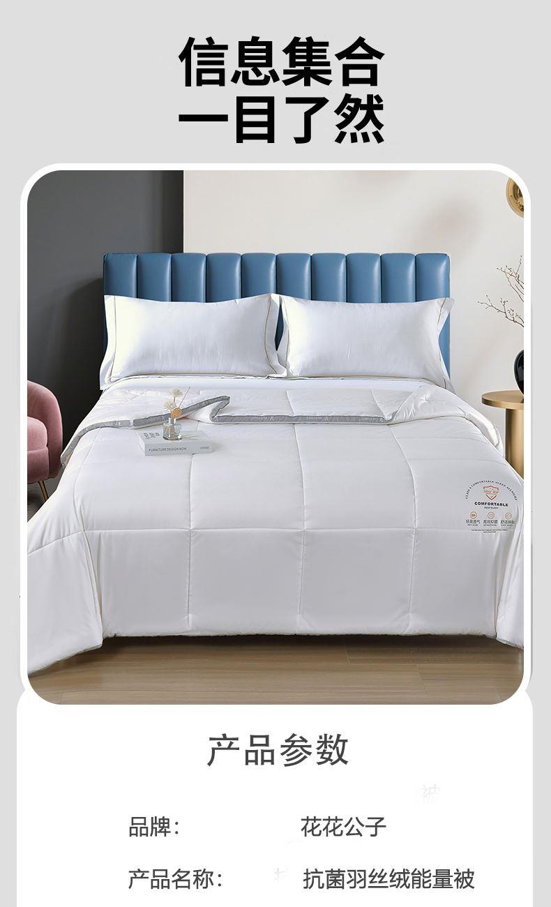 规格:200*230cm 面料: 防羽布 填充: 羽丝绒 重量:2800g 执行标准:GB/T22796-2021 安全类别:GB18401-2010 B类 1.甄选珠光棉面料,手感软糯细腻,珠般光泽,软糯厚实不起球; 2.黄金羽丝绒填充,纤维紧密锁定空气,产生稳定空气层,锁温保暖; 3.3D立体航空舱绗缝设计,立体立衬分区,保持被芯的高弹蓬松,不易变形。